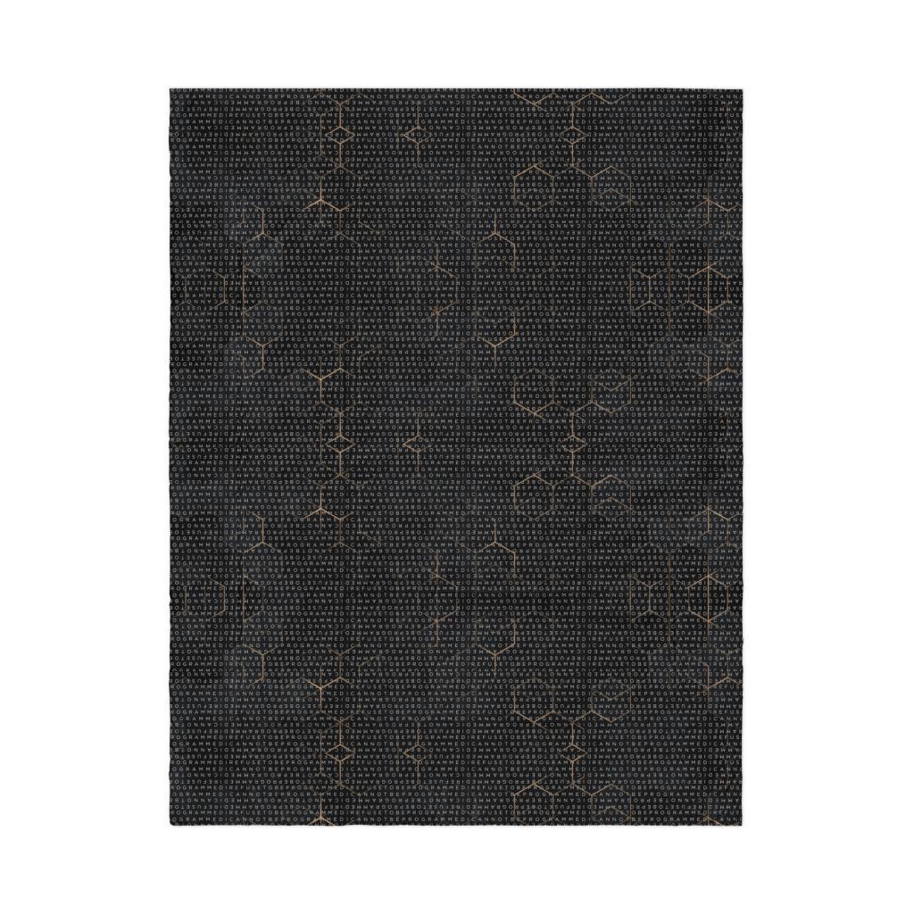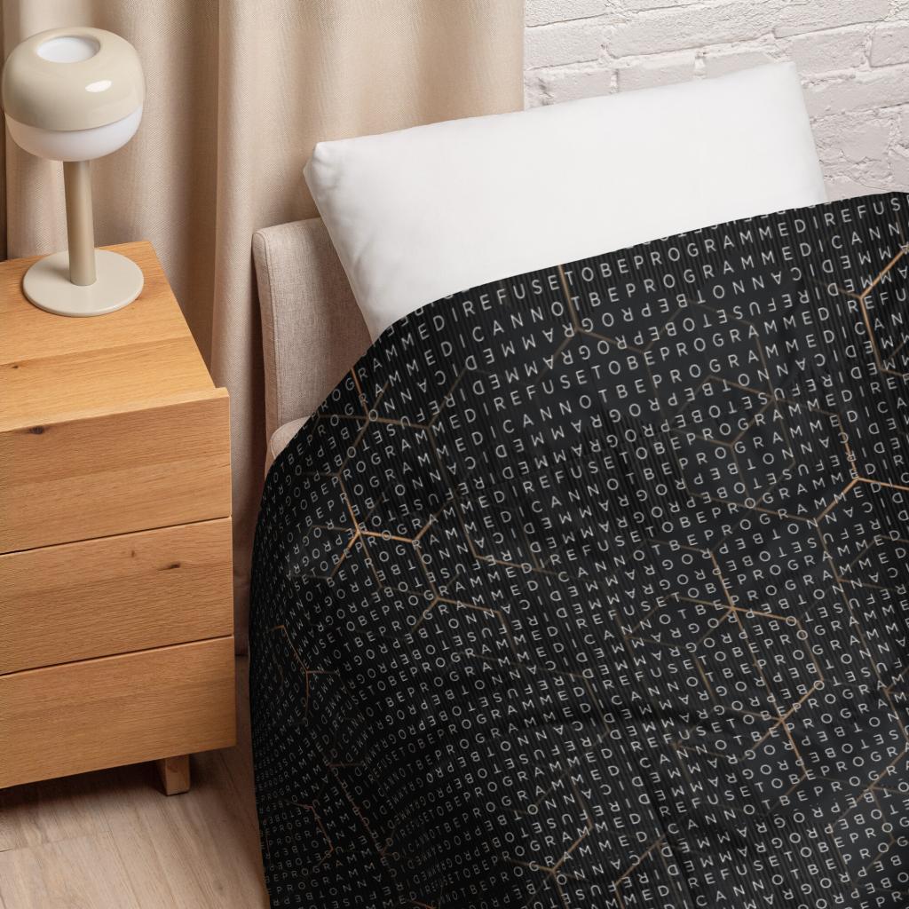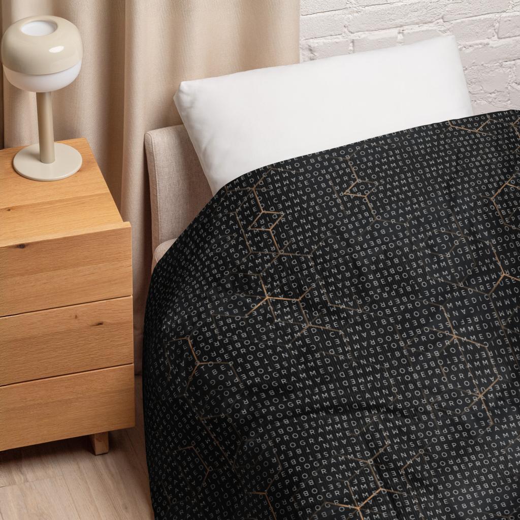 Bundle up and get cozy with this I Refuse to be Programmed white monogrammed lightweight comforter. The comforter features one side that is white and the designed side features the dark golden grid base pattern with the I Refuse to be Programmed/I Cannot be Programmed white monogram reverse jacquard cascading across. Made from an ultra-soft polyester microfiber fabric and filled with 3/4 inch batting that is evenly distributed and held in double square stitching. This will allow you to wrap yourself in warmth with this ultra-soft, lightweight comforter—perfect for lazy mornings or chilly nights in.