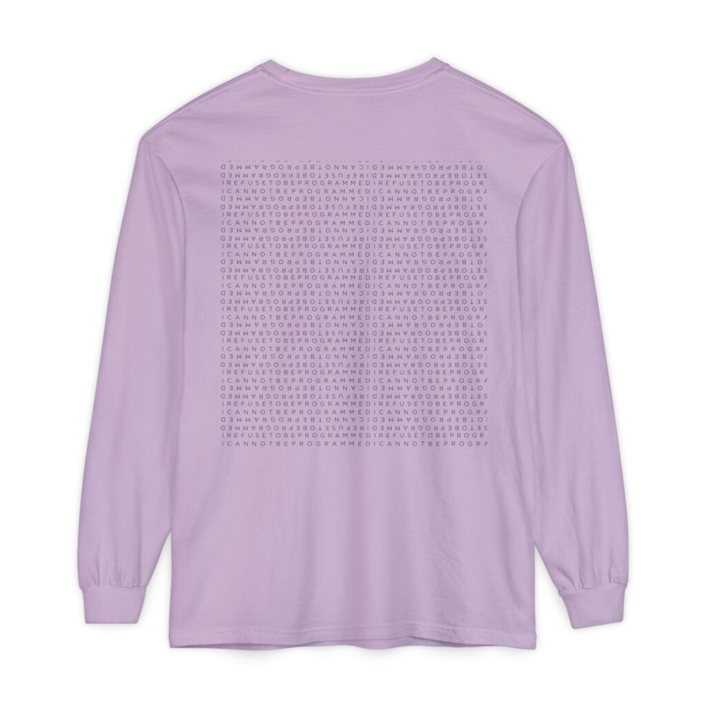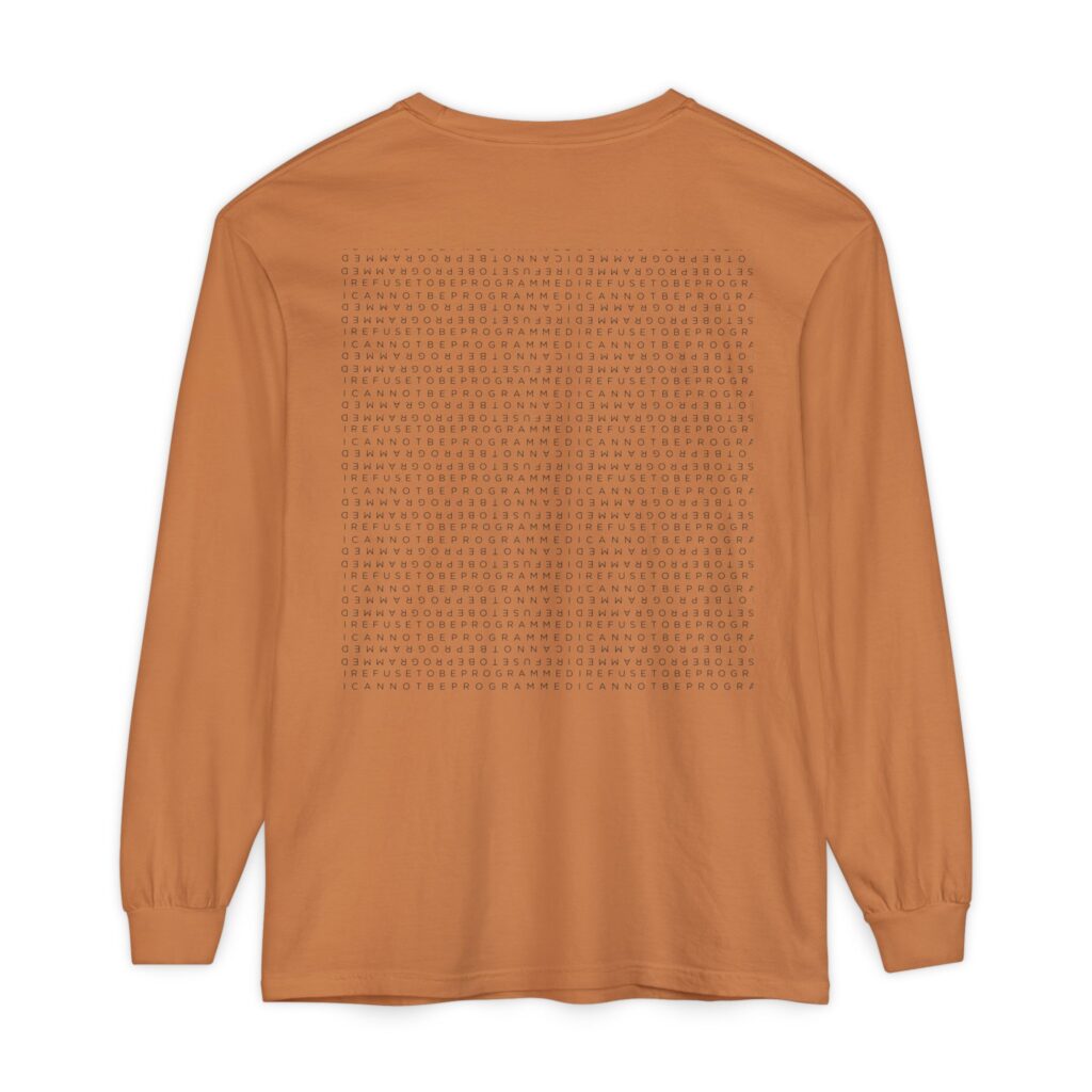 This I Refuse to be Programmed men’s super-soft crew sun graphic shirt is a unique look for wearing when the temperature begins to drop but is light enough to not be overbearing when its warm. This shirt is made from 100% ring spun cotton and features a graphic of a sun that is formed with the I Refuse to be Programmed monogram in white.