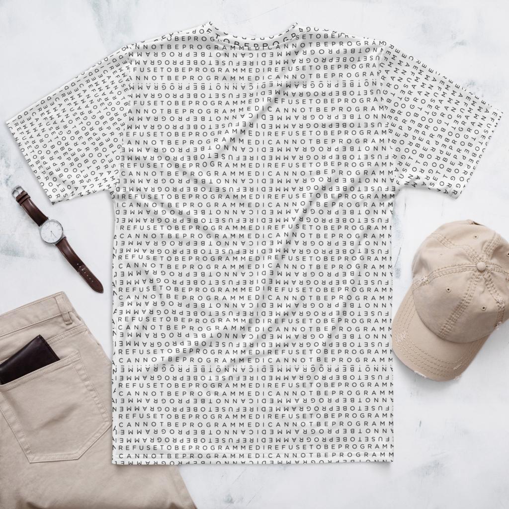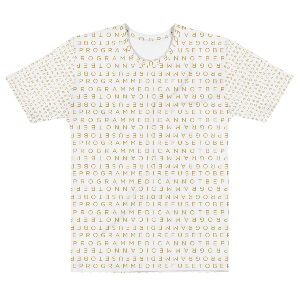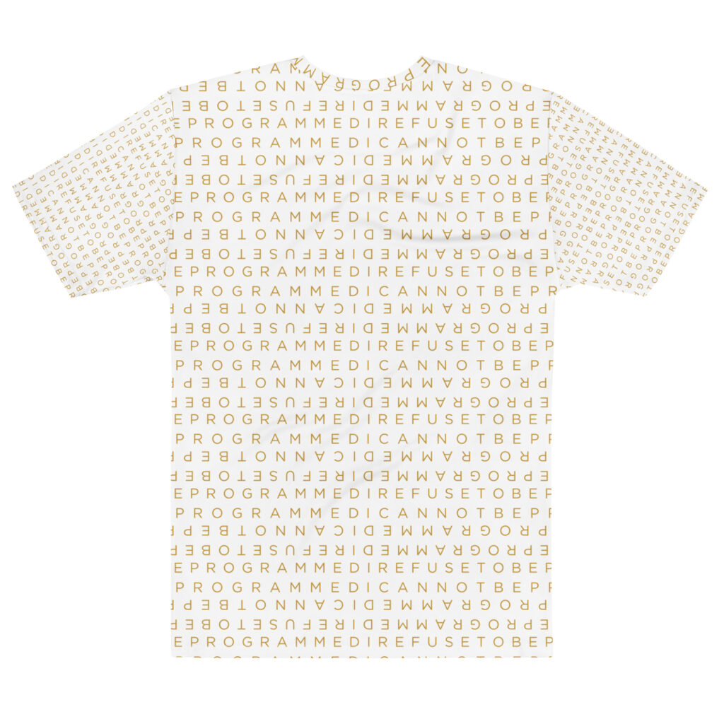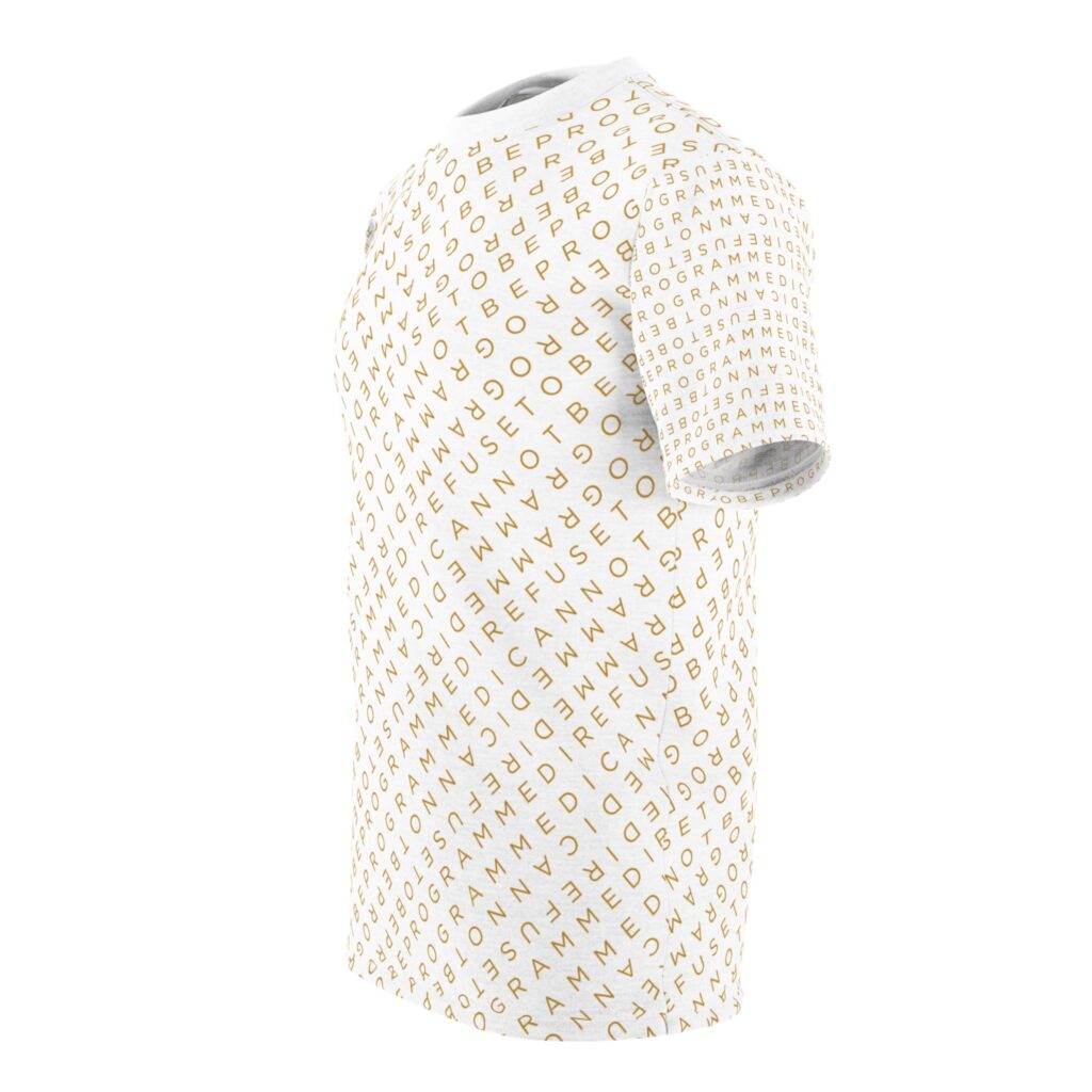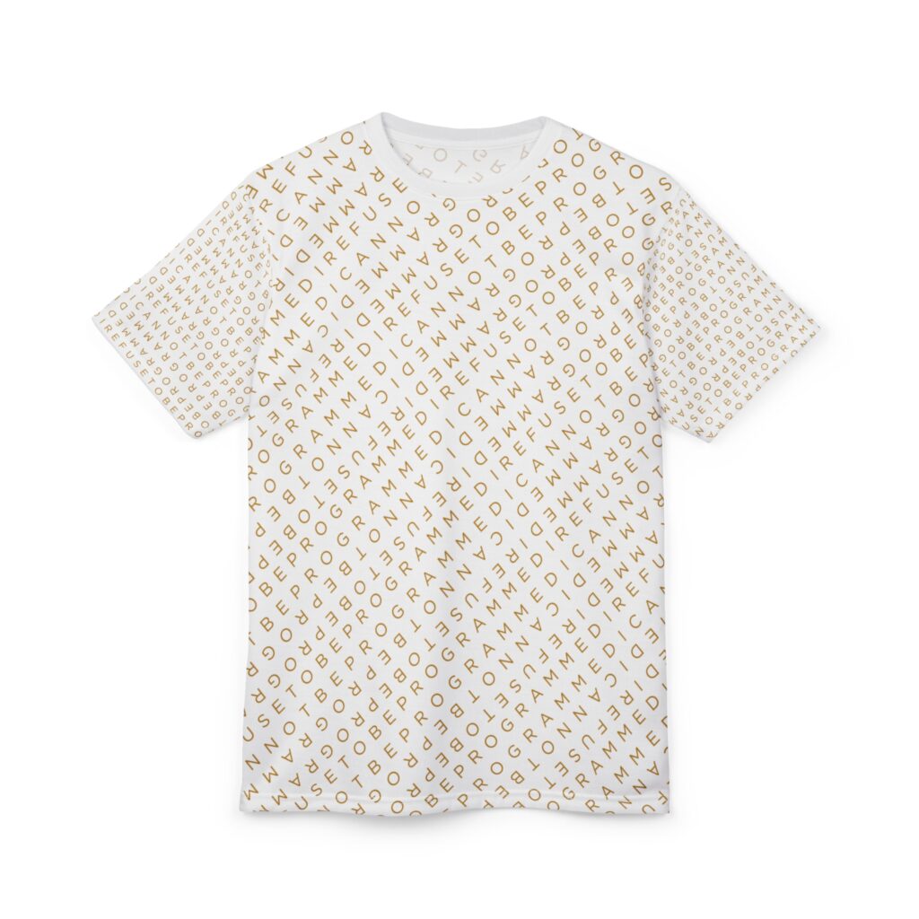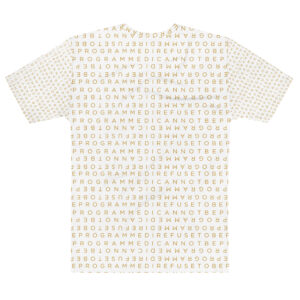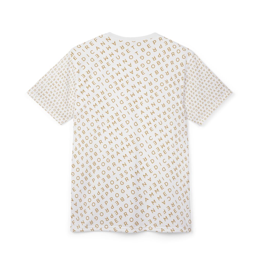 Designed to be unique and fashionable, the I Refuse to Be Programmed monogram shirt features the phrase “I Refuse to be Programmed” and “I Cannot be Programmed” in a layered and reversed jacquard style monogram print across your new favorite fit clothes. The golden print cascaded on white fabric looks sophisticated and unique. Providing a clear and bold standout effect that will make sure people will take time to read what your statement is. And what better way to let people know you aren’t a sell-out: this shirt is uniquely textured, thick, microfiber-knit fabric. Insuring a comfortable fashion experience with a sophisticated look and a clear message. While still providing a soft feel that remains lightweight and highly breathable