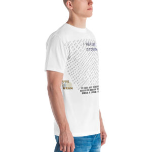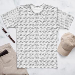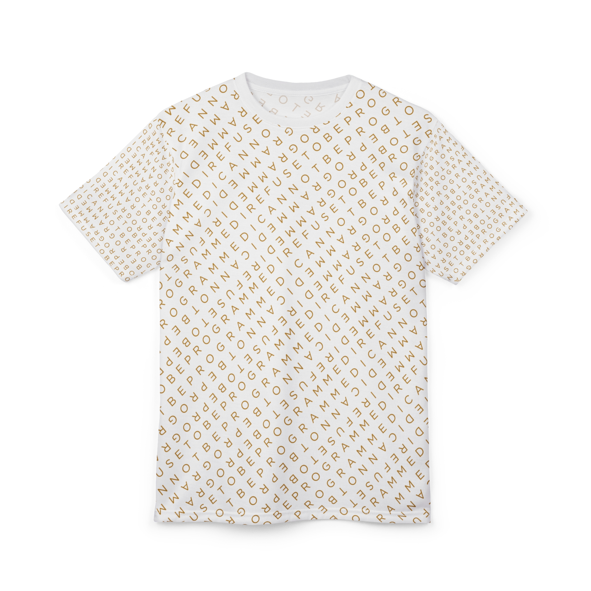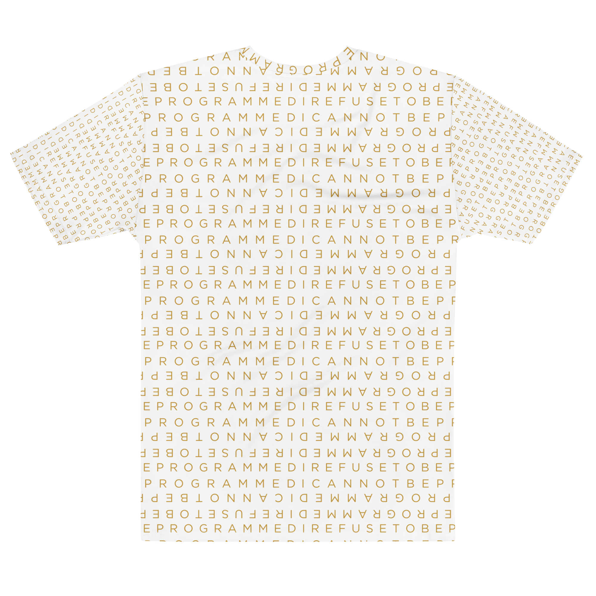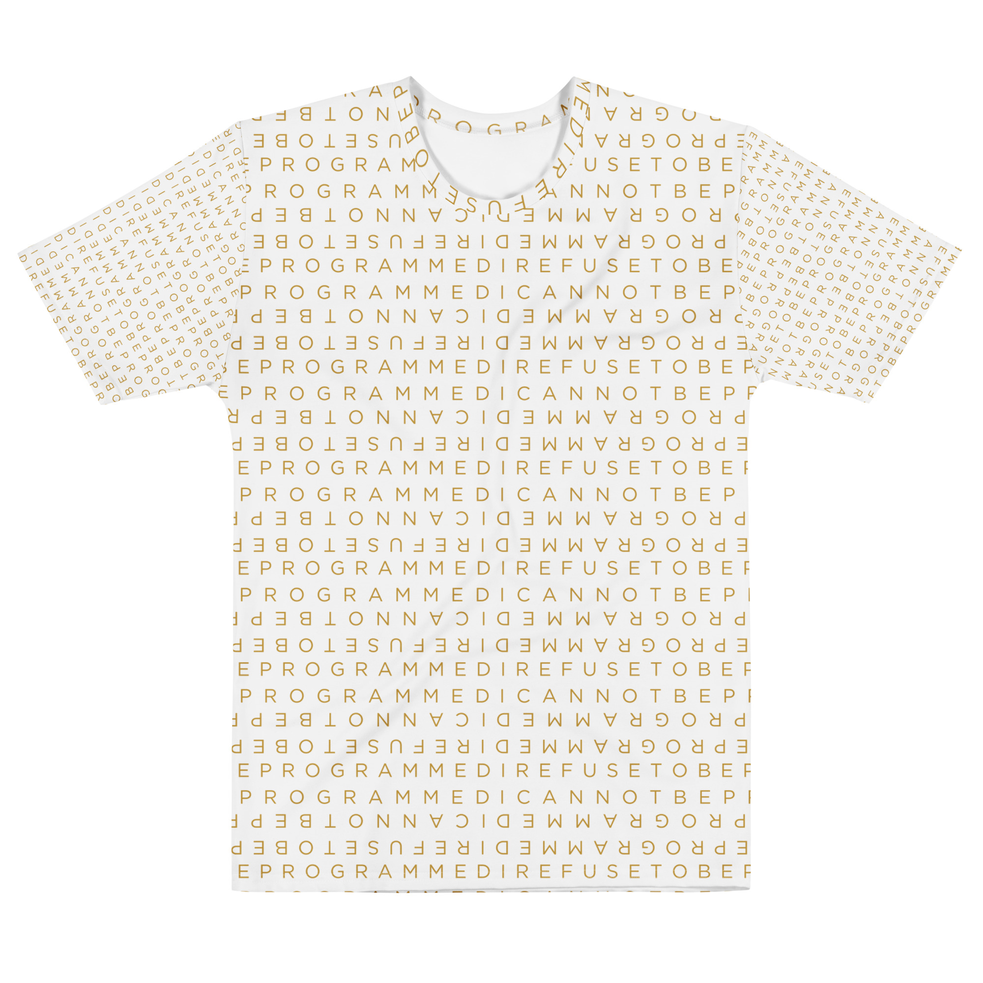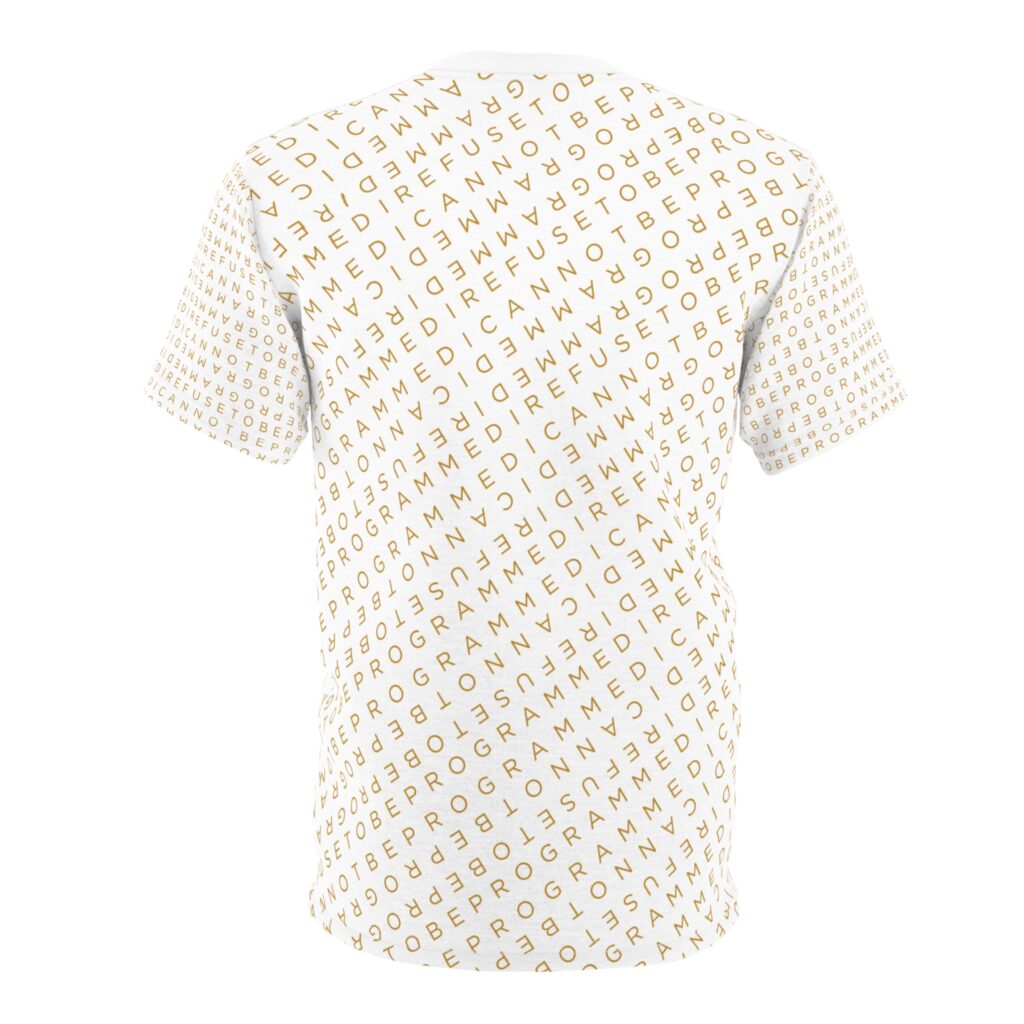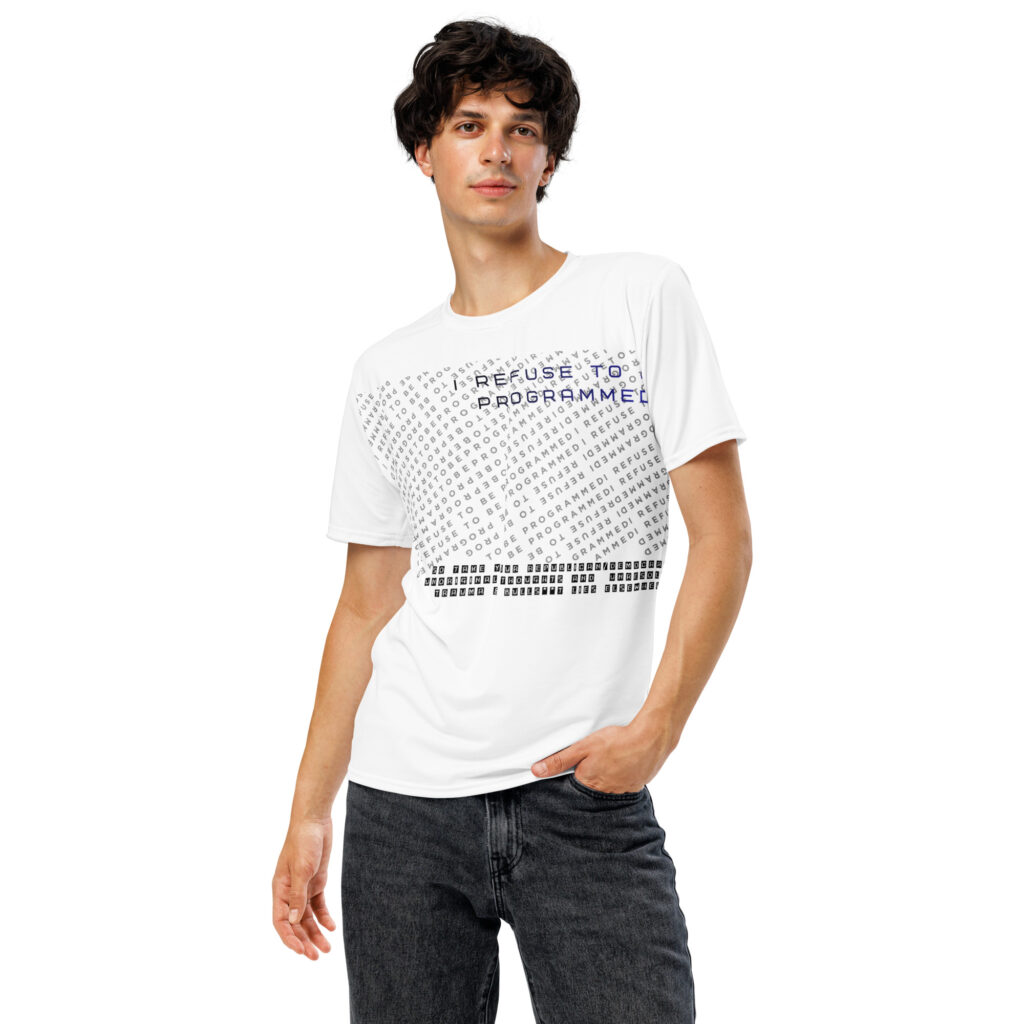 Designed to be unique and fashionable, the I Refuse to Be Programmed monogram shirt features the phrase “I Refuse to be Programmed” and “I Cannot be Programmed” in a layered and reversed jacquard style monogram print across your new favorite fit clothes. The golden print cascaded on white fabric looks sophisticated and unique. Providing a clear and bold standout effect that will make sure people will take time to read what your statement is. And what better way to let people know you aren’t a sell-out: this shirt is uniquely textured, thick, microfiber-knit fabric. Insuring a comfortable fashion experience with a sophisticated look and a clear message. While still providing a soft feel that remains lightweight and highly breathable