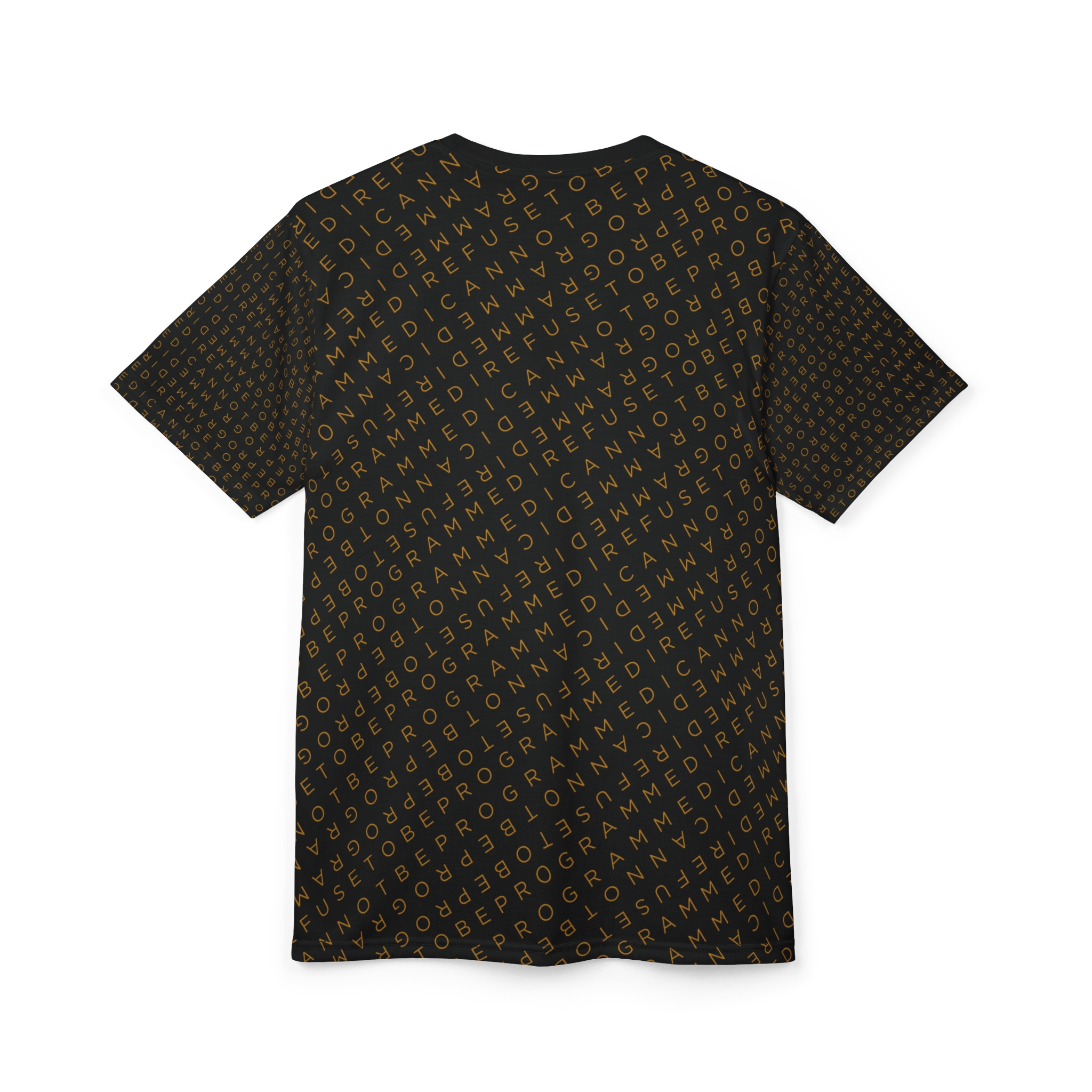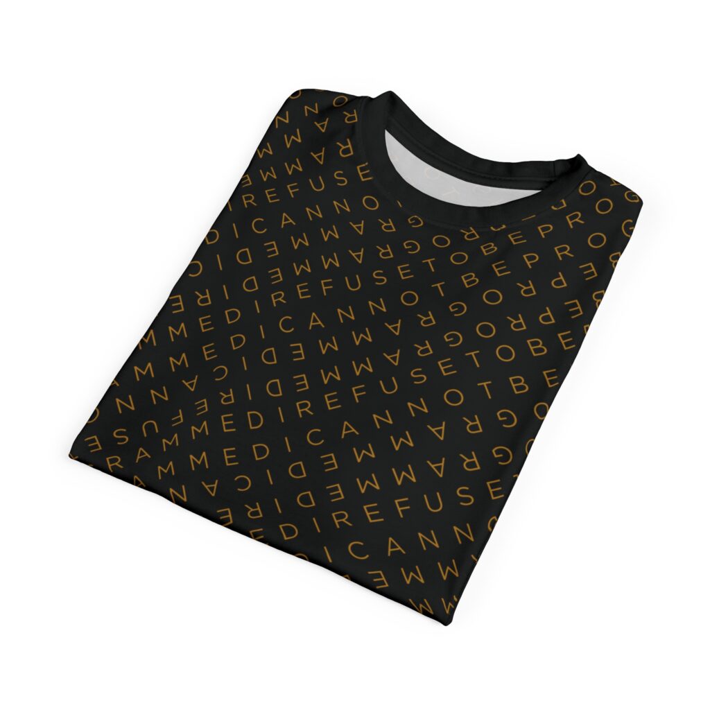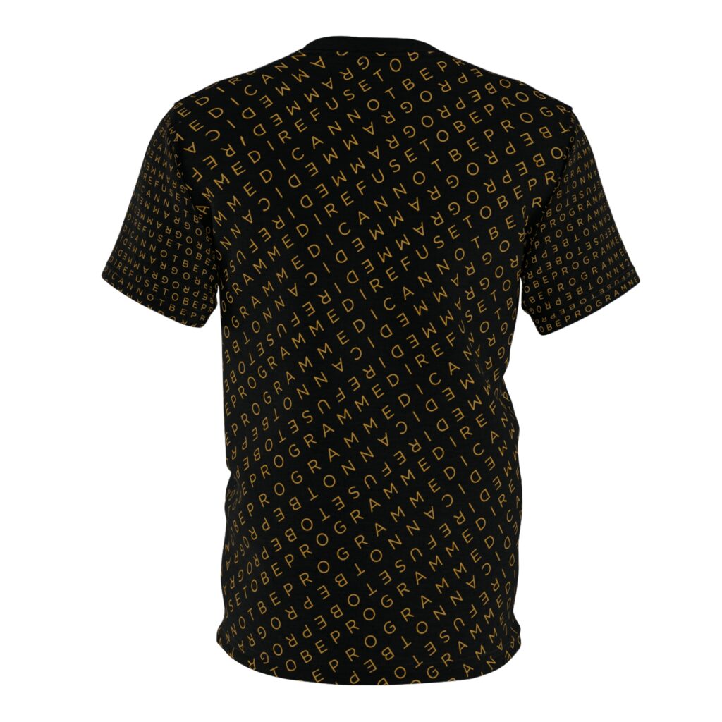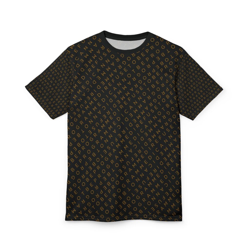 Designed to be unique and fashionable, the I Refuse to Be Programmed monogram shirt features the phrase “I Refuse to be Programmed” and “I Cannot be Programmed” in a layered and reversed jacquard style monogram print across your new favorite fit clothes. The golden print cascaded on black fabric looks sophisticated and unique. Providing a clear and bold standout effect that will make sure people will take time to read what your statement is. And what better way to let people know you aren’t a sell-out: this shirt is uniquely textured, thick, microfiber-knit fabric. Insuring a comfortable fashion experience with a sophisticated look and a clear message. While still providing a soft feel that remains lightweight and highly breathable