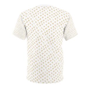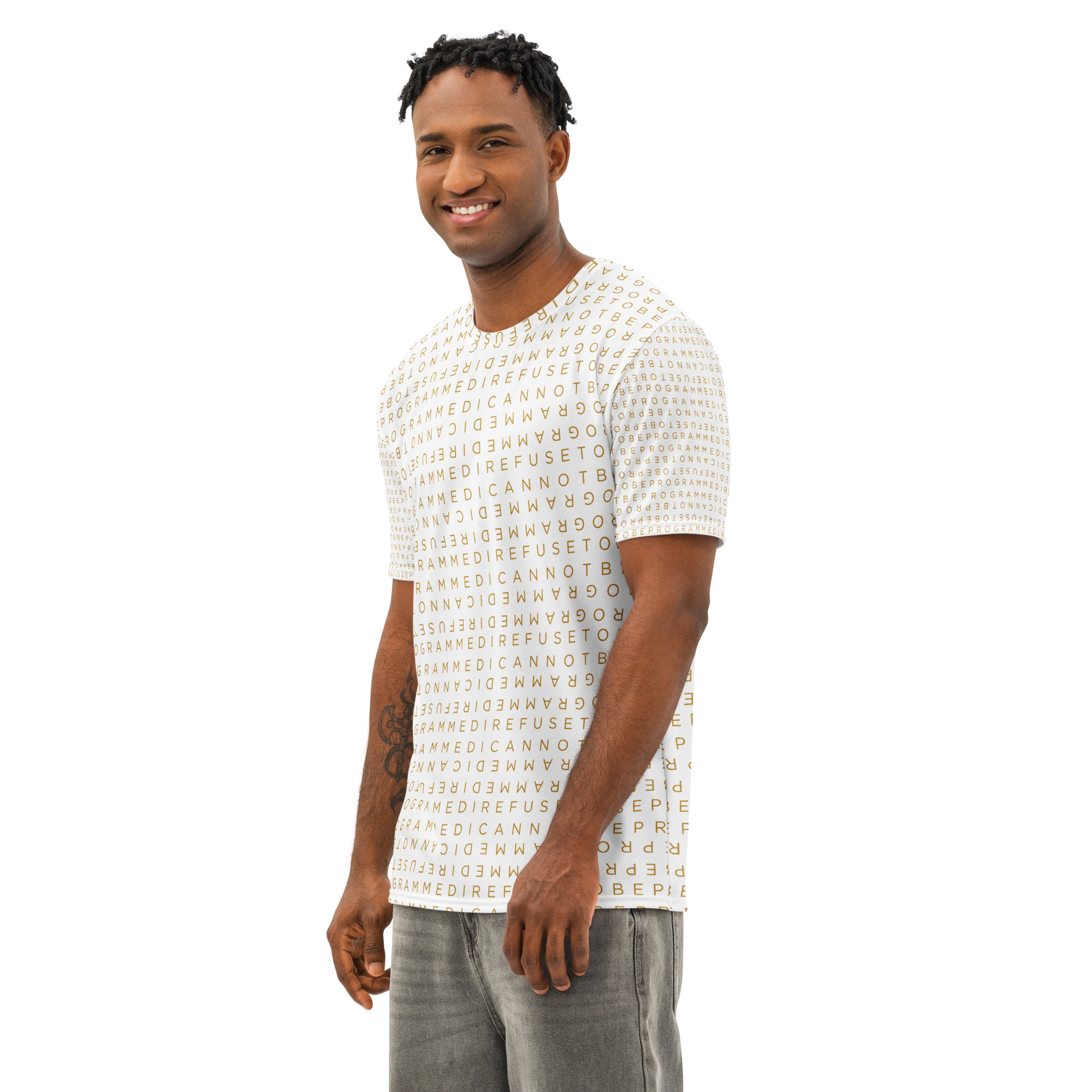 This cotton t-shirt combines clean structure with long-lasting comfort, it features the I Refuse to be Programmed signature gold monogram atop white fabric. The soft, midweight fabric keeps its shape and feels great from the first wear to the hundredth. A reliable staple for streetwear, loungewear, or everyday looks.