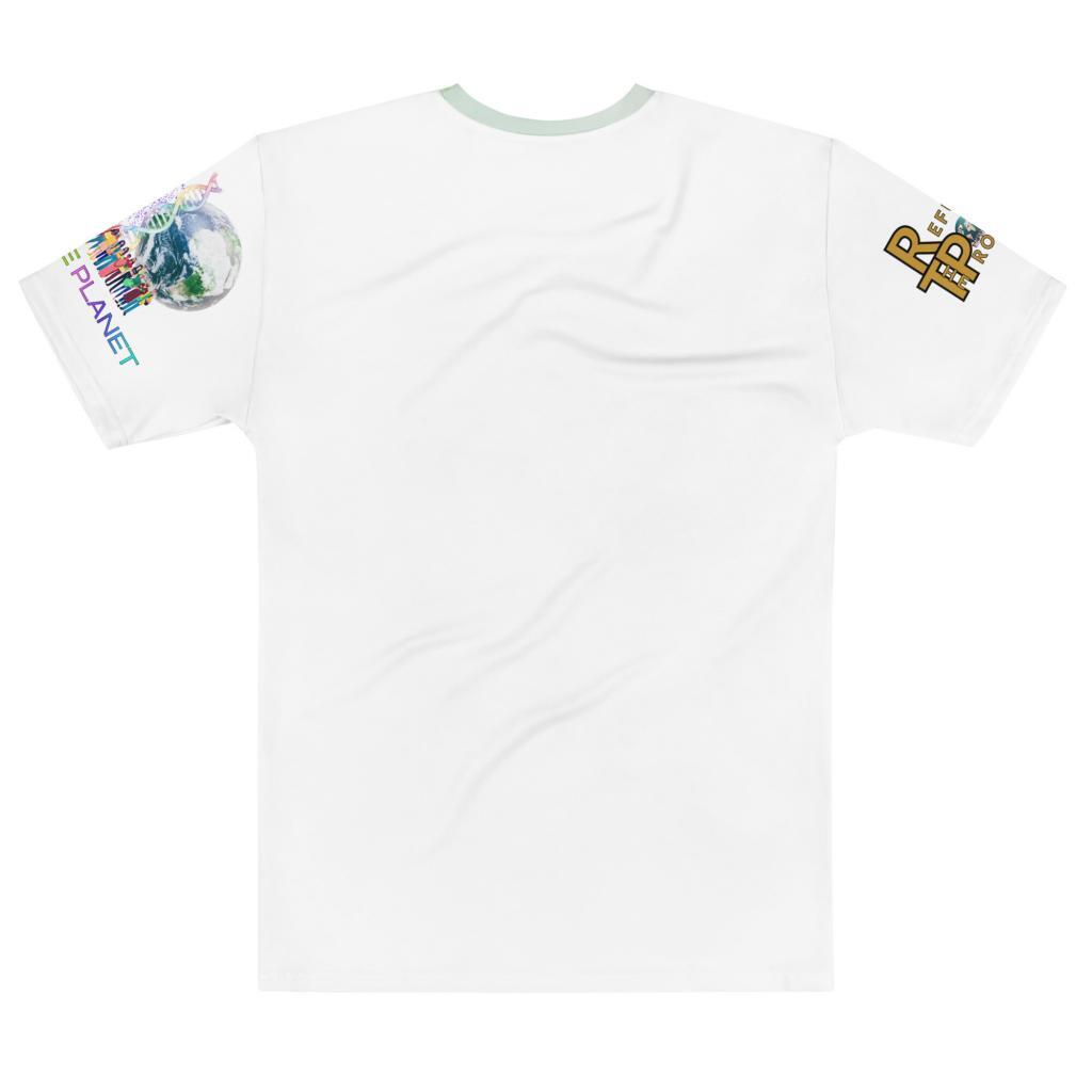 Show your stance and support for our world with this graphic print cotton short sleeve shirt for men. The shirt features an image of mother nature embracing her child, our world, and features the Save the Planet and Refuse the Program logos on each sleeve while combining sturdy design and lasting comfort
