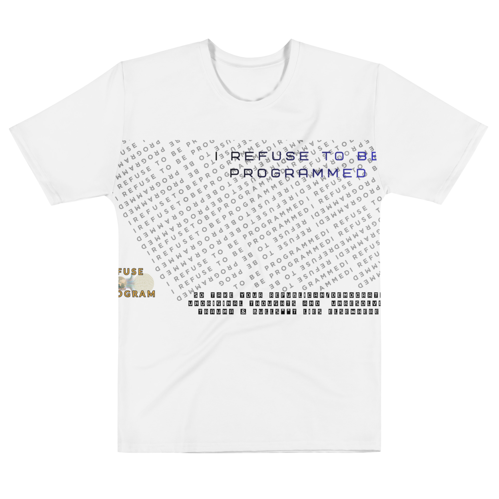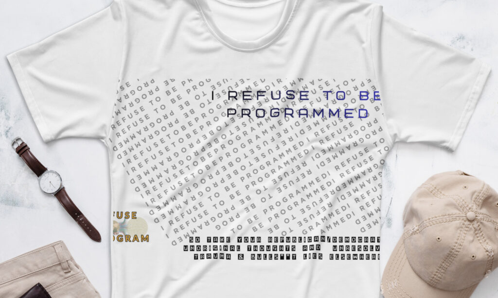A new favorite featured fusion slogan shirt for men features the Refuse the Program logo on the right side of the shirt with the “I Refuse to be Programmed” monogram in black on the main area with a slogan that states “I REFUSE TO BE PROGRAMMED, SO TAKE YOUR REPUBLICAN/DEMOCRAT, UNORIGINAL THOUGHTS AND UNRESOLVED TRAUMA & BULLS**T LIES ELSEWHERE”