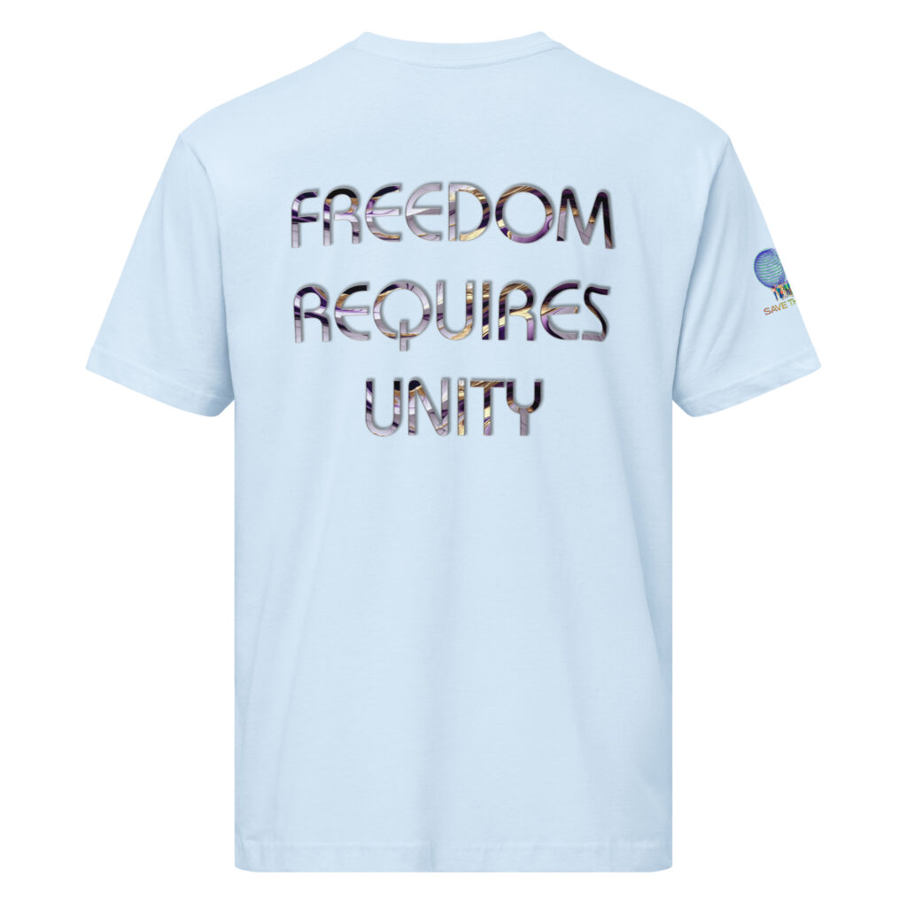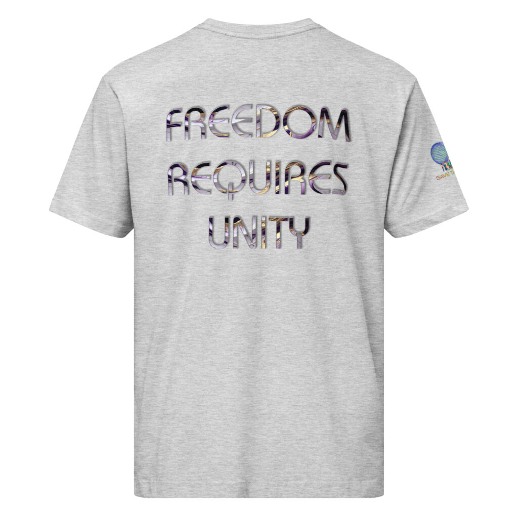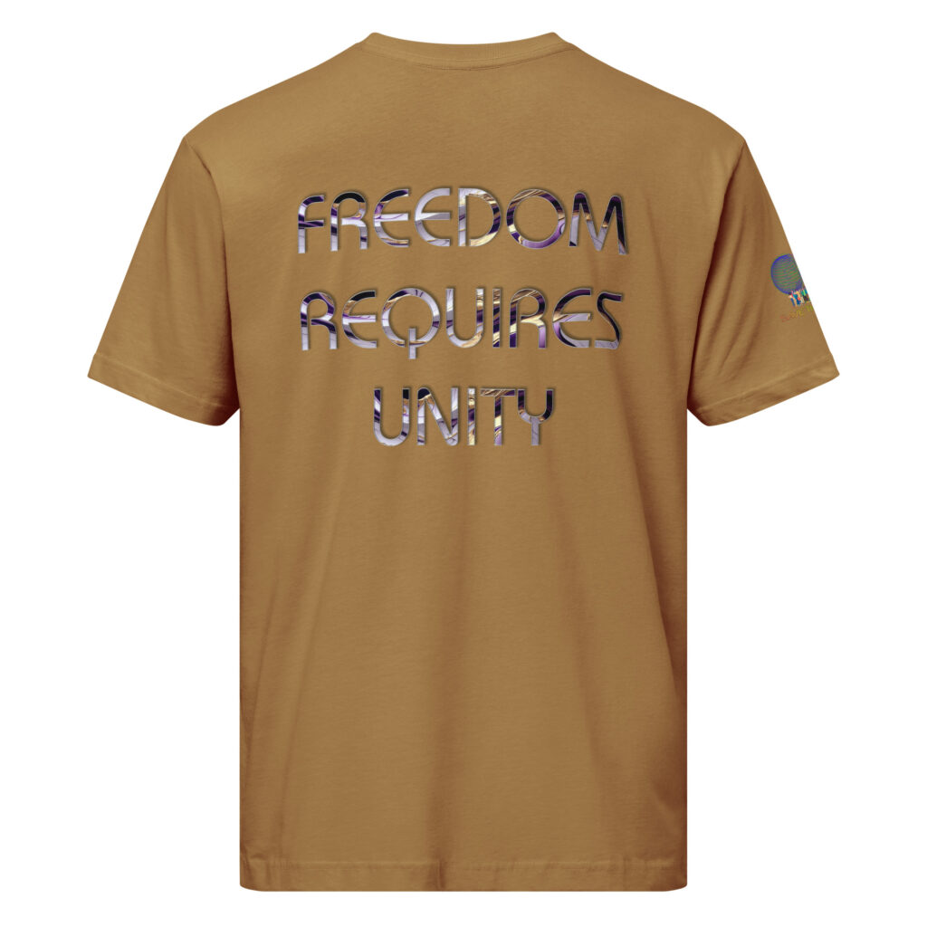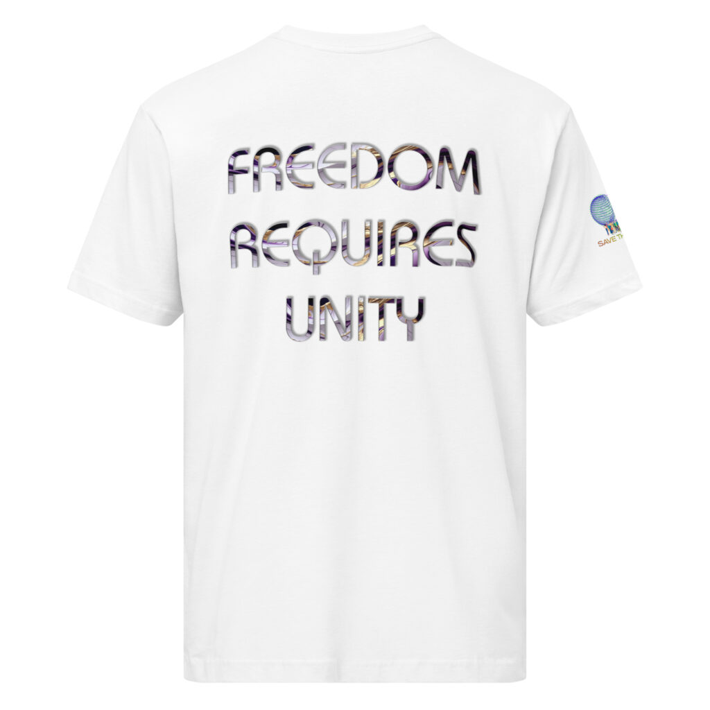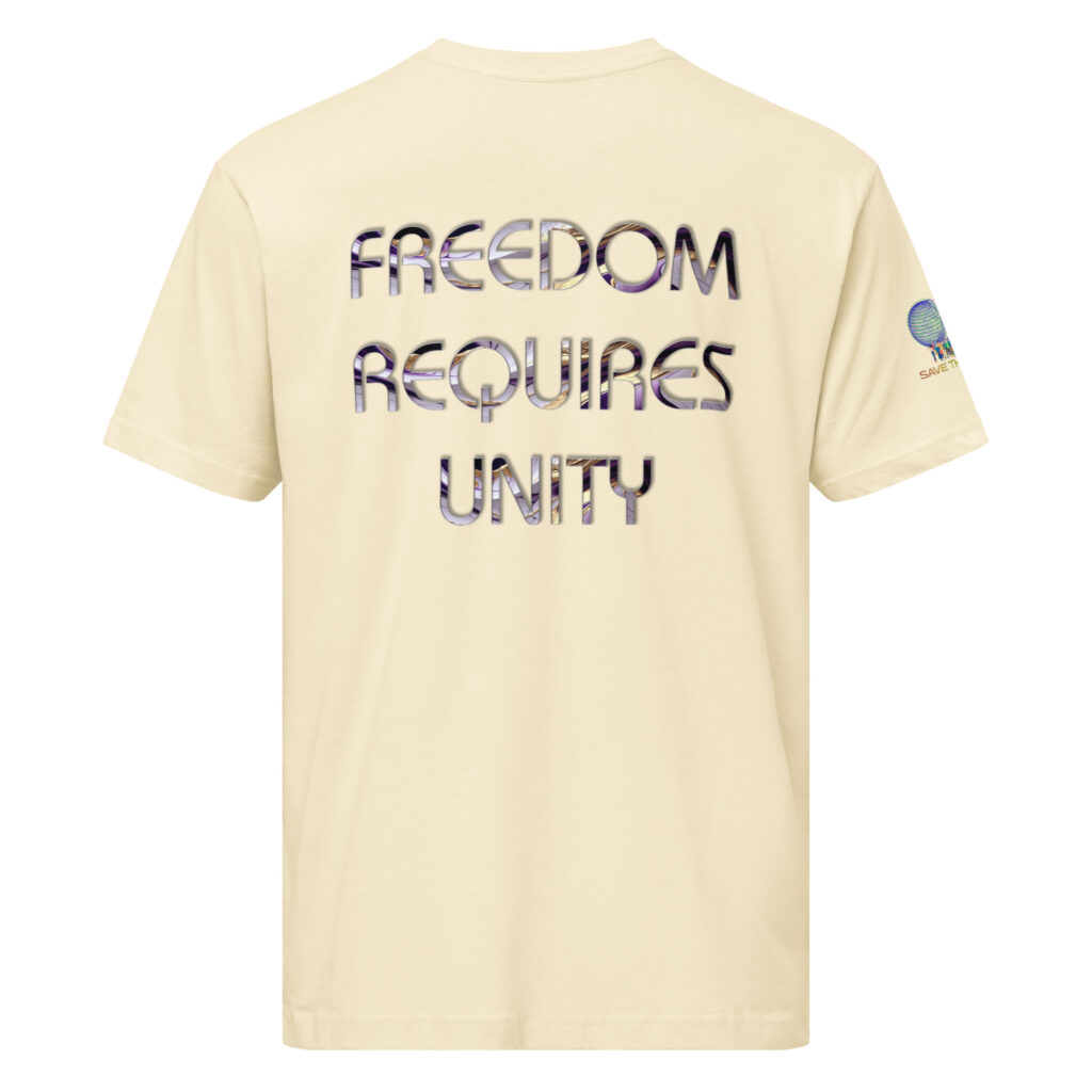 A stylish cotton shirt featuring the slogan “Freedom Requires Unity” printed in golden abstract purple on the back with a Save the Planet logo on the right sleeve. The shirt is available in various colors and is a good conversation starter.