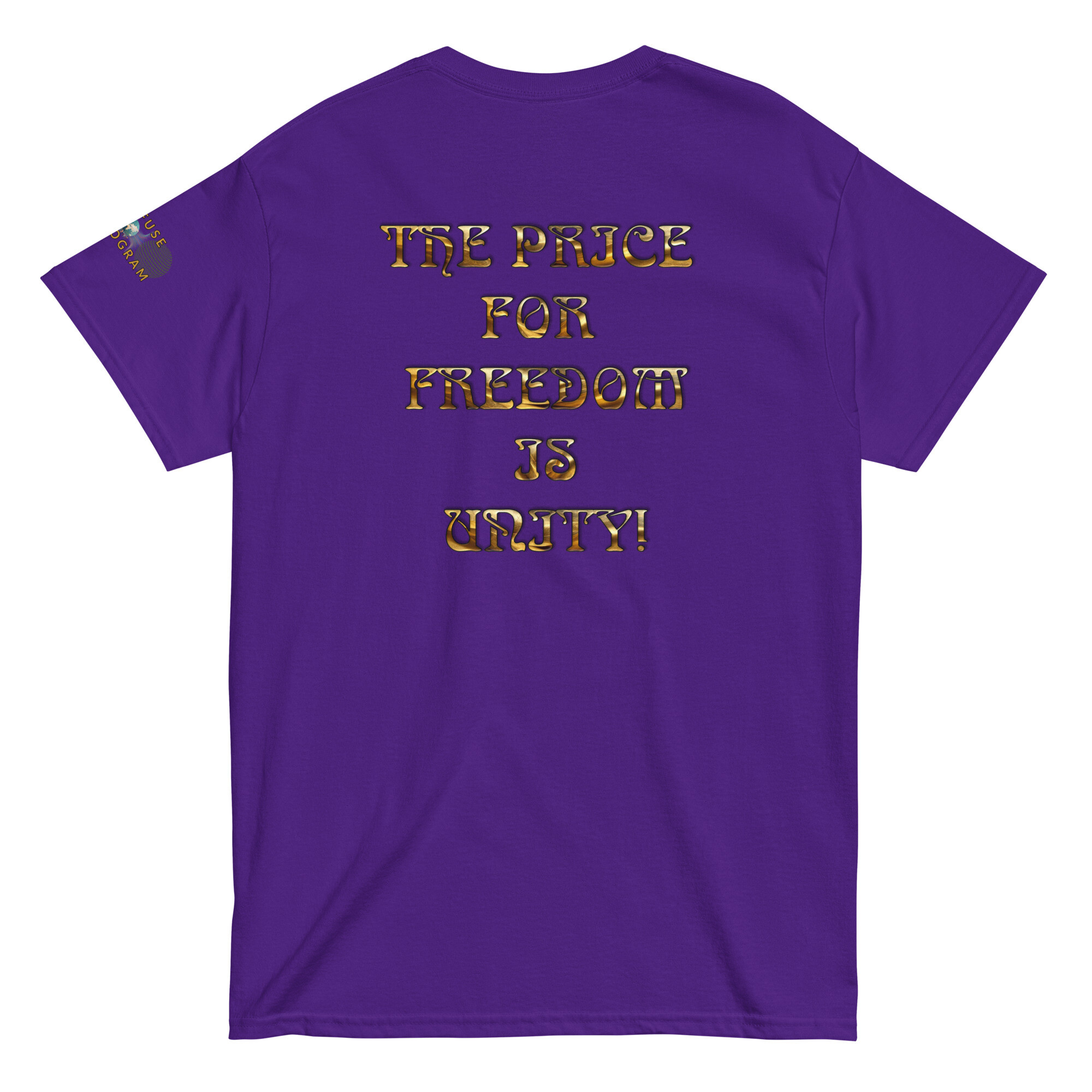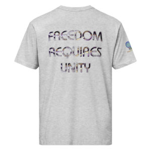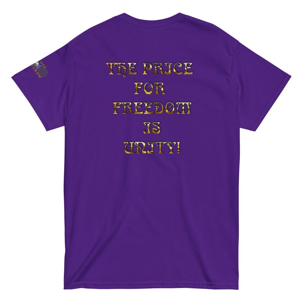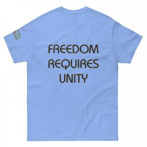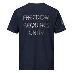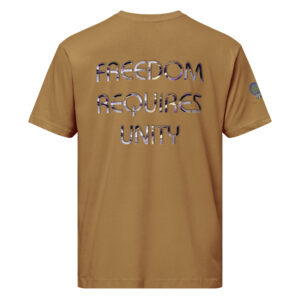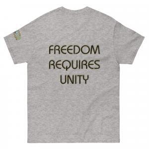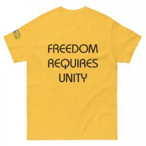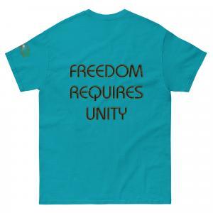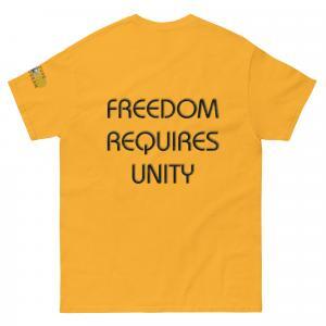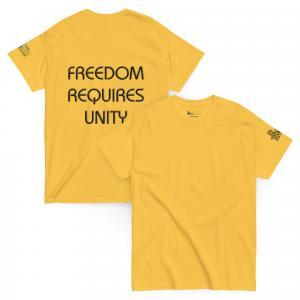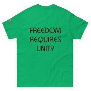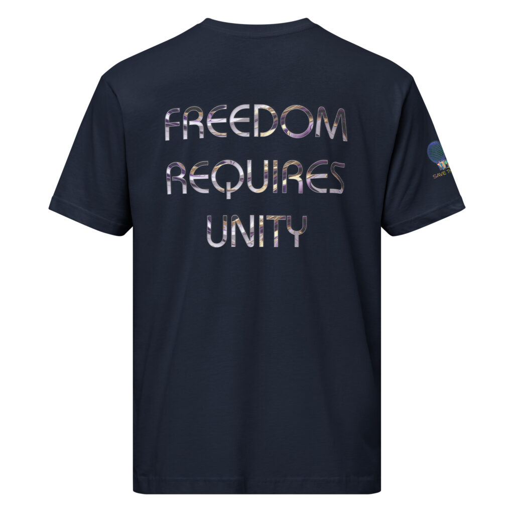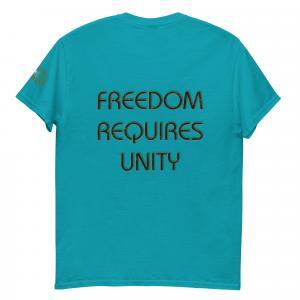 A stylish cotton shirt featuring the slogan “Freedom Requires Unity” printed in golden abstract purple on the back with a Save the Planet logo on the right sleeve. The shirt is available in various colors and is a good conversation starter.