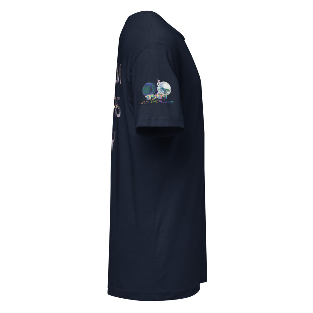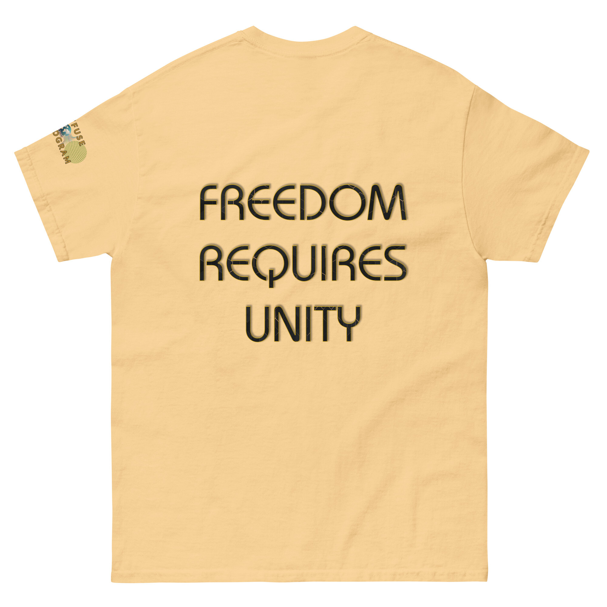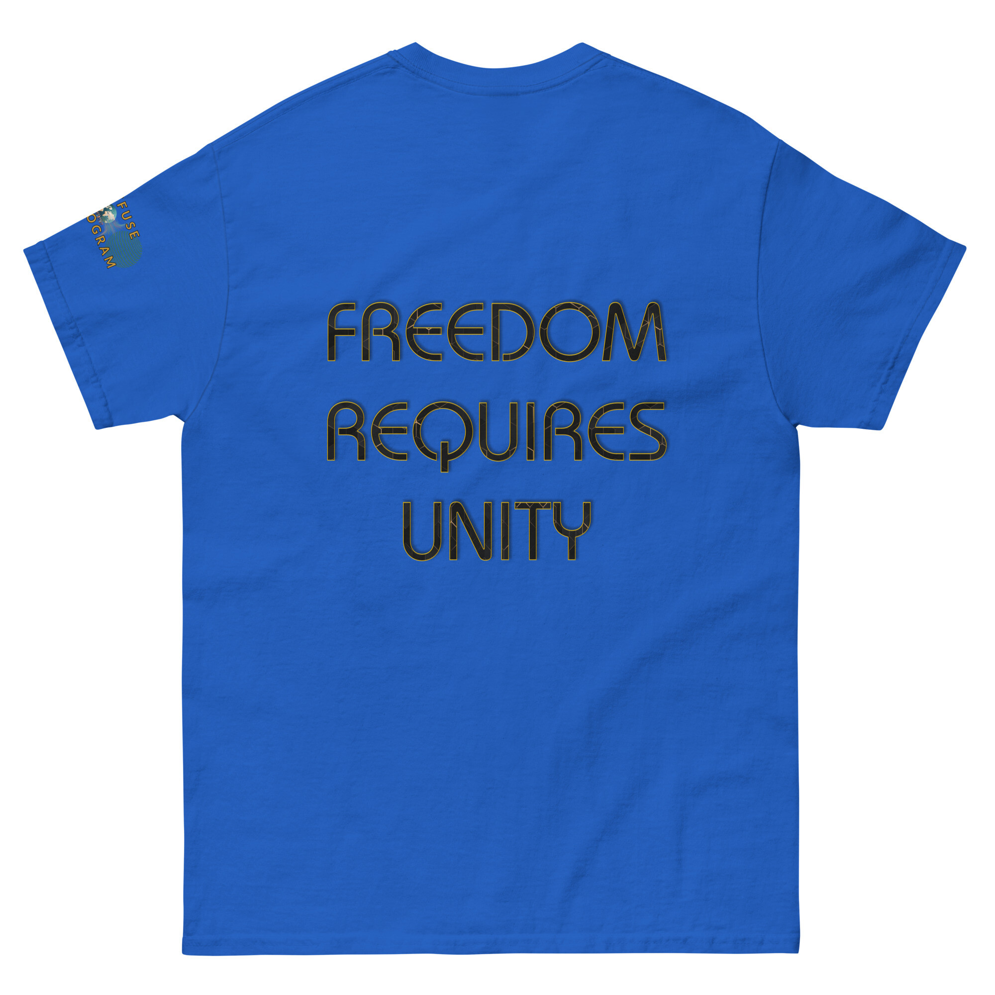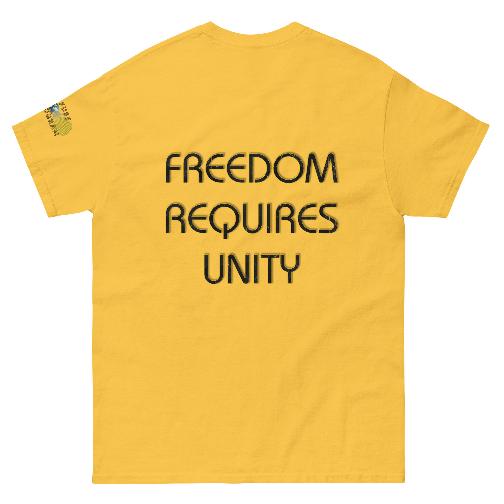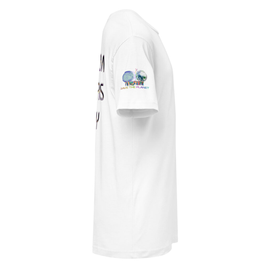 A stylish cotton shirt featuring the slogan “Freedom Requires Unity” printed in golden abstract purple on the back with a Save the Planet logo on the right sleeve. The shirt is available in various colors and is a good conversation starter.