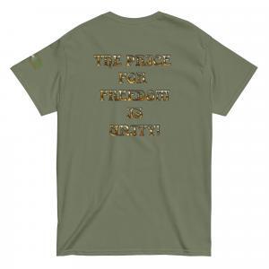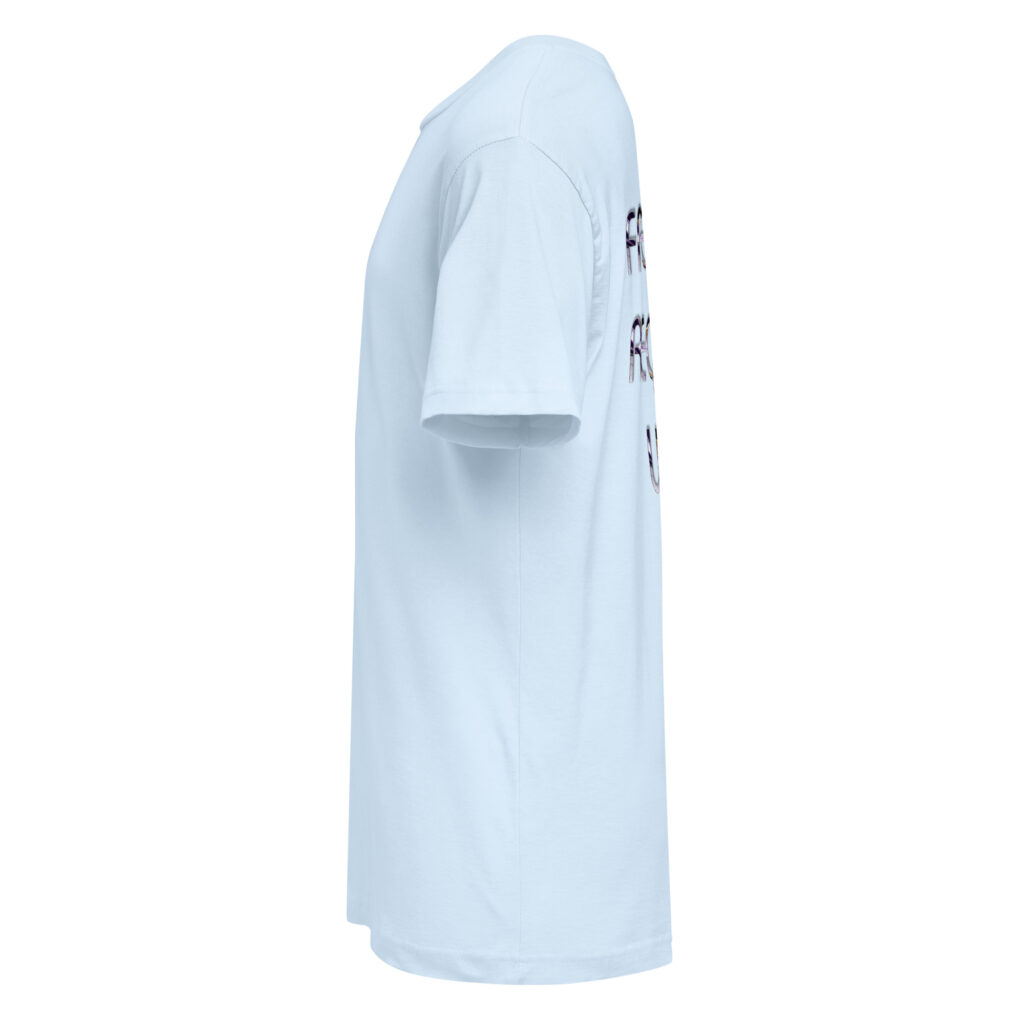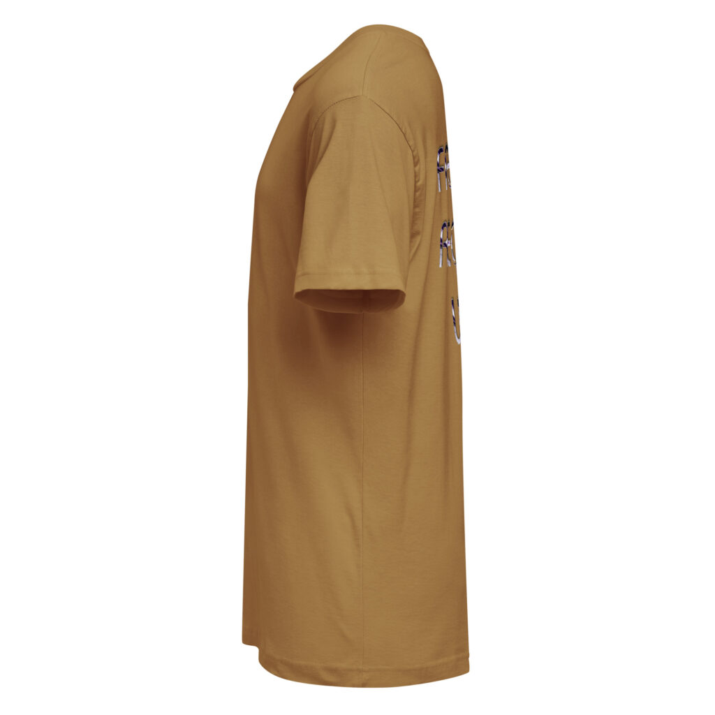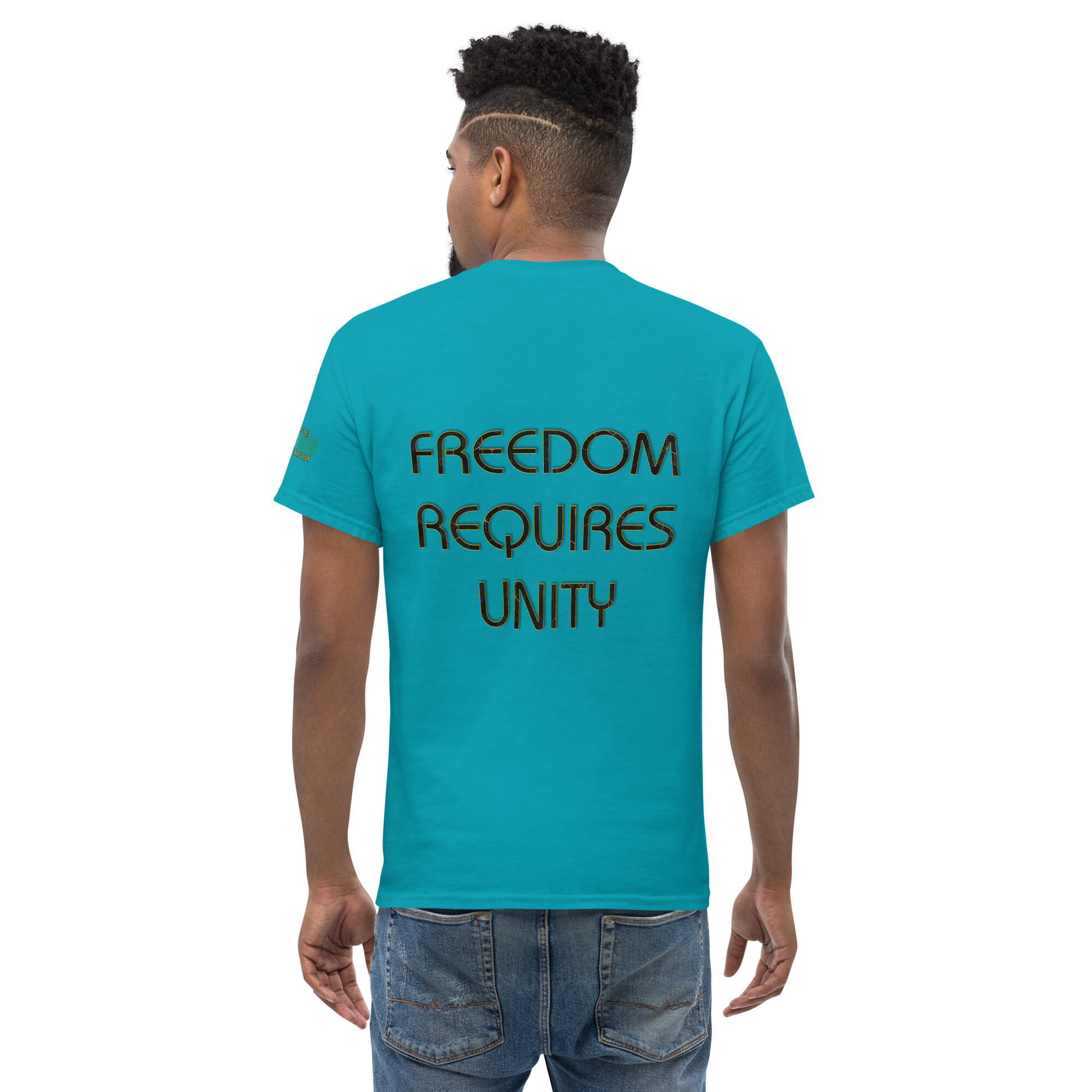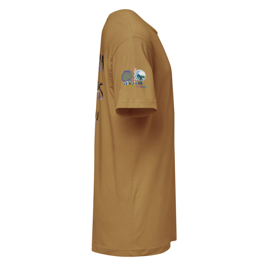A stylish cotton shirt featuring the slogan “Freedom Requires Unity” printed in golden abstract purple on the back with a Save the Planet logo on the right sleeve. The shirt is available in various colors and is a good conversation starter.