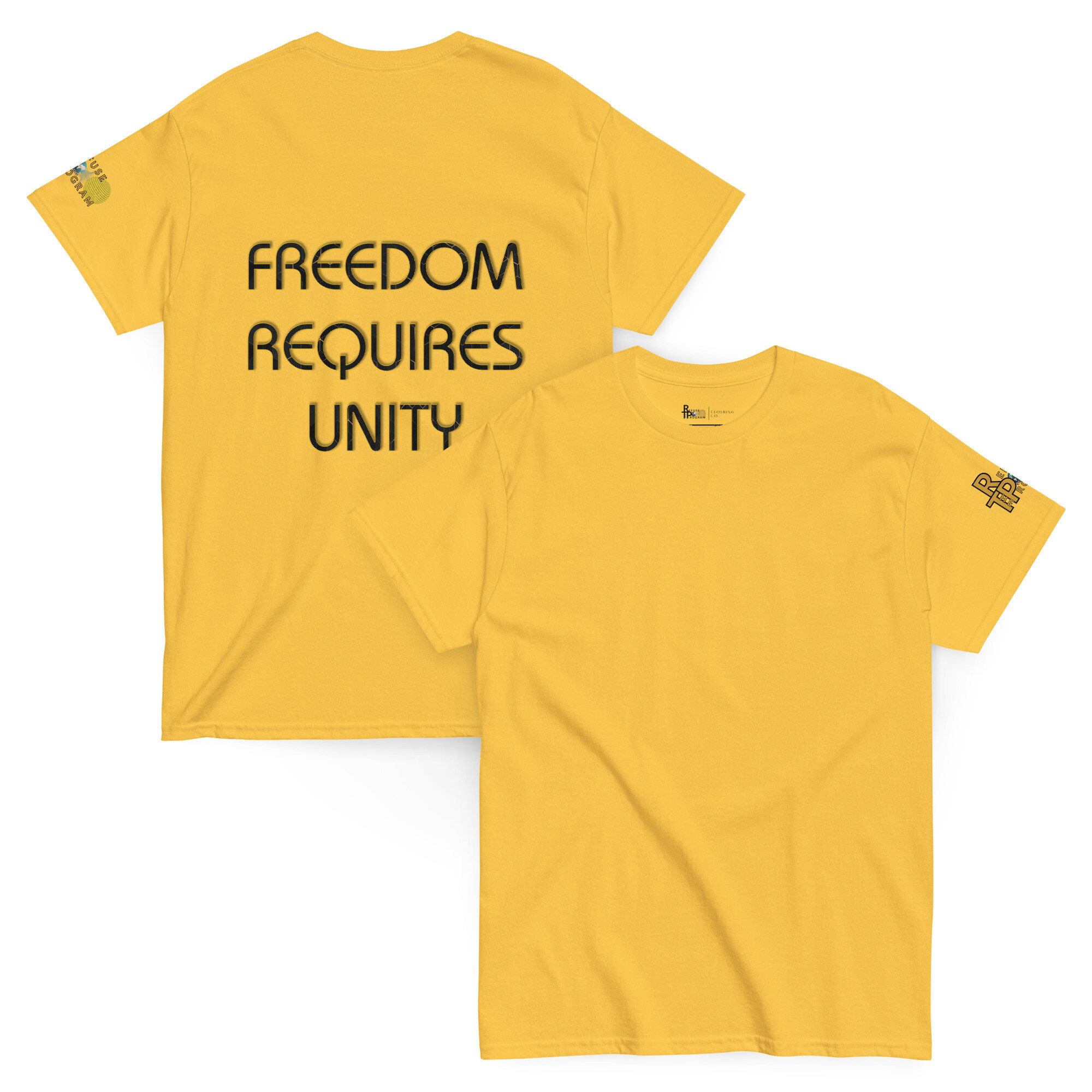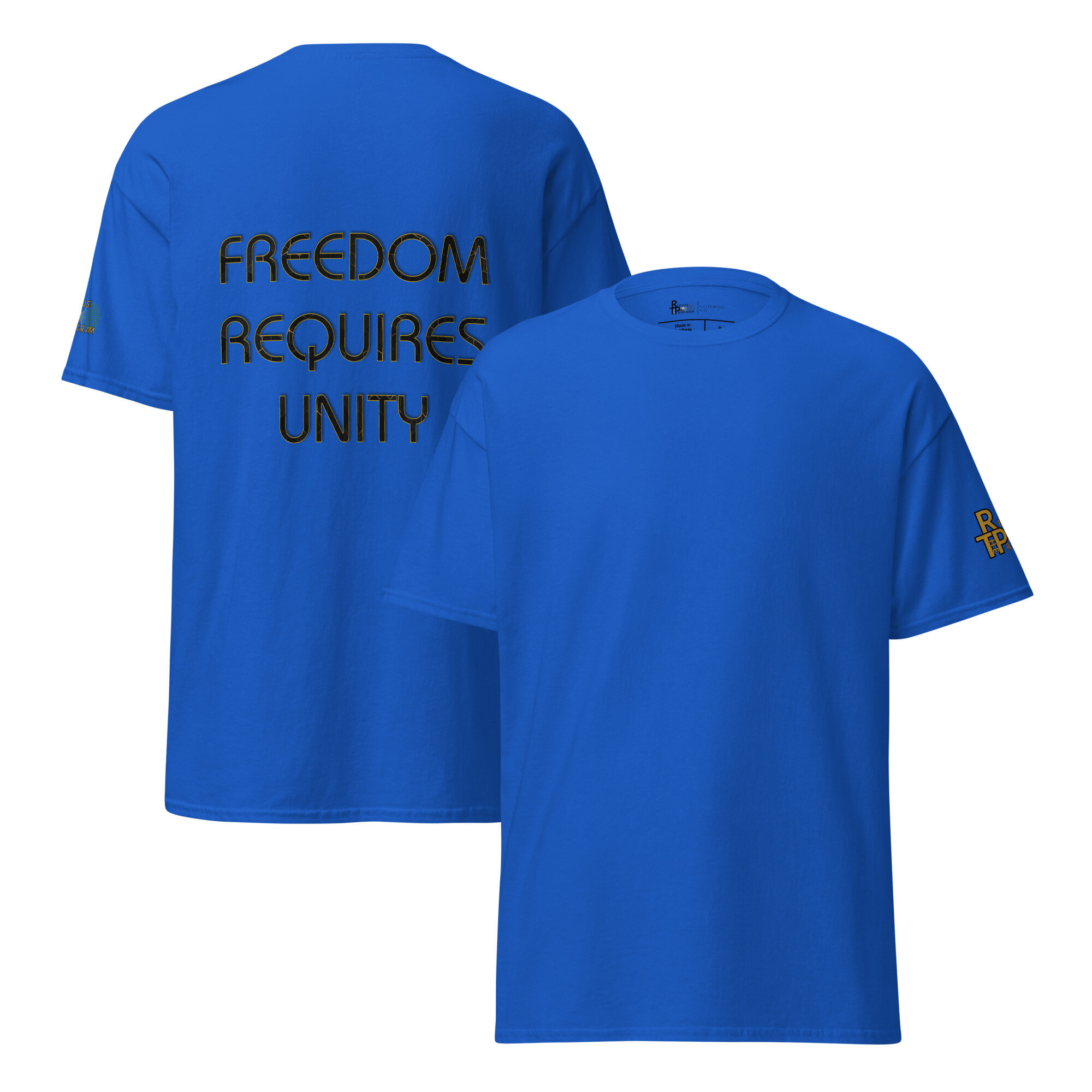 Our Refuse the Program slogan graphic print shirt is available in a wide variety of popular base colors and is designed to be unisex and features the slogan “Freedom Requires Unity” in beveled text on the back as well as a Refuse the Program logo on the left sleeve. The shirt is made from primarily cotton but some color variations contain polyester. Disclaimers: