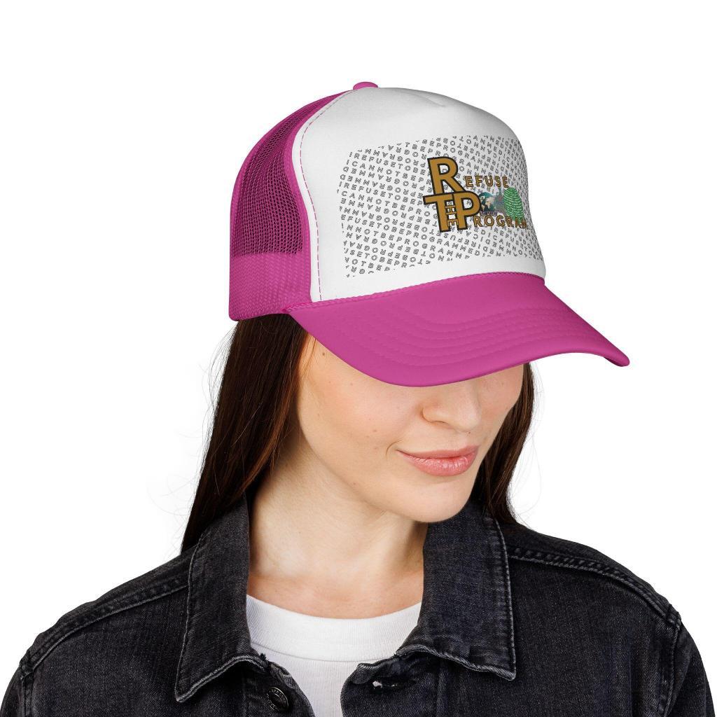 Showcase your individuality and refusal of being programmed with this versatile fit trucker cap. Made with polyester with a nylon mesh weave in the back making them extremely durable against regular wear and tear. Adjustable with a plastic snap closure and available in a variety of great color choices.