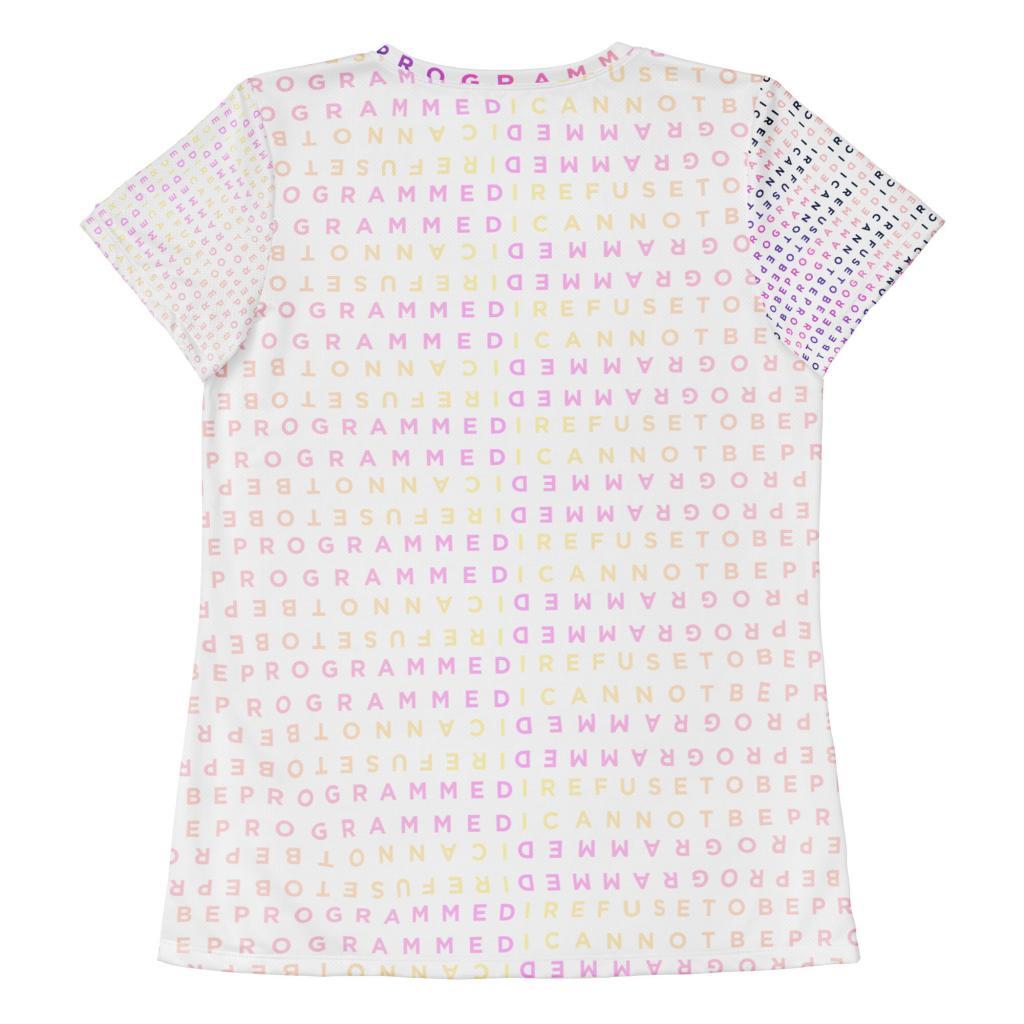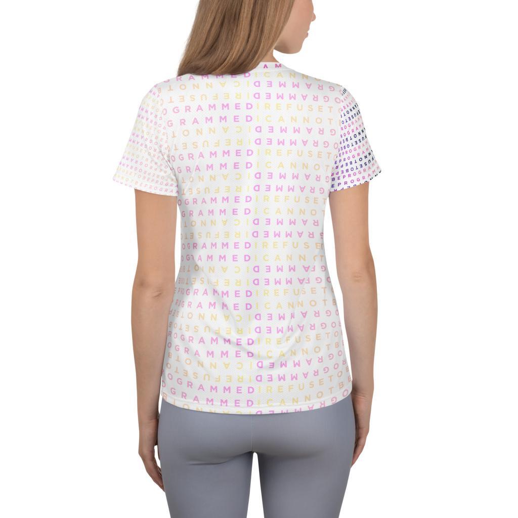 • Women’s I Refuse to be Programmed Darkness Into Light Pink Monogram Athletic Shirt with UPF 50+ Protection