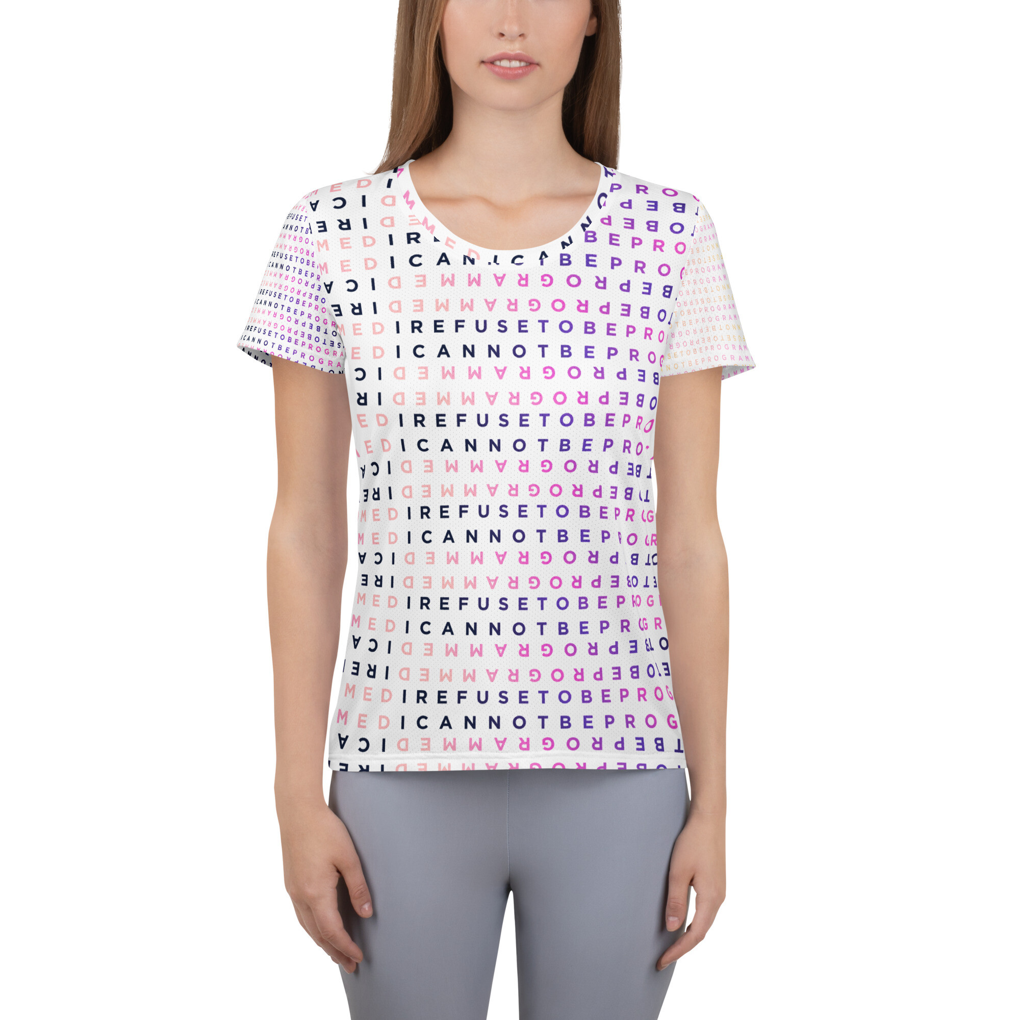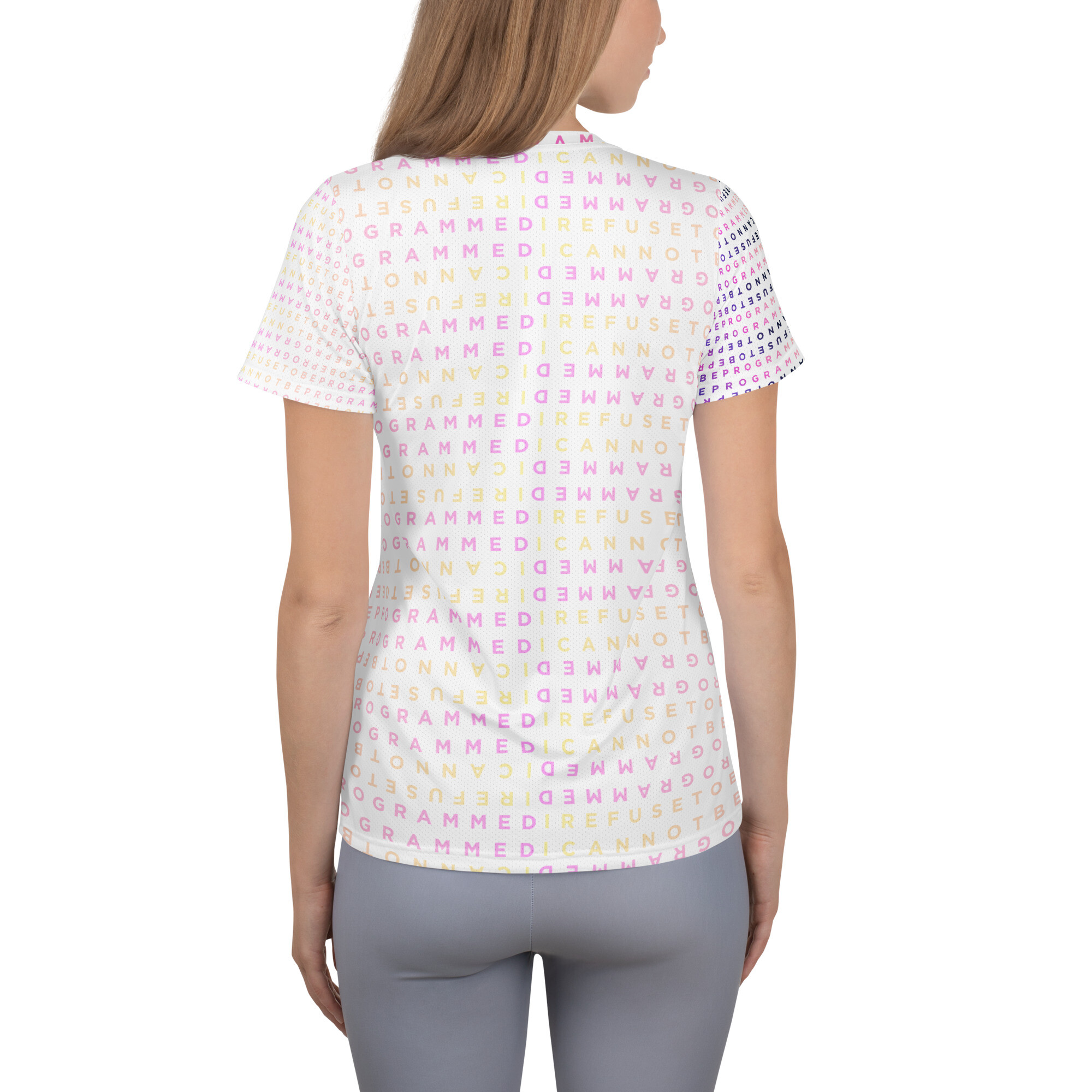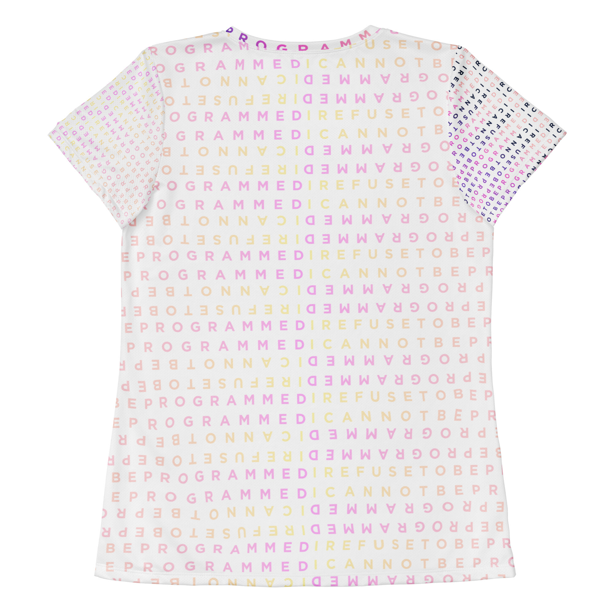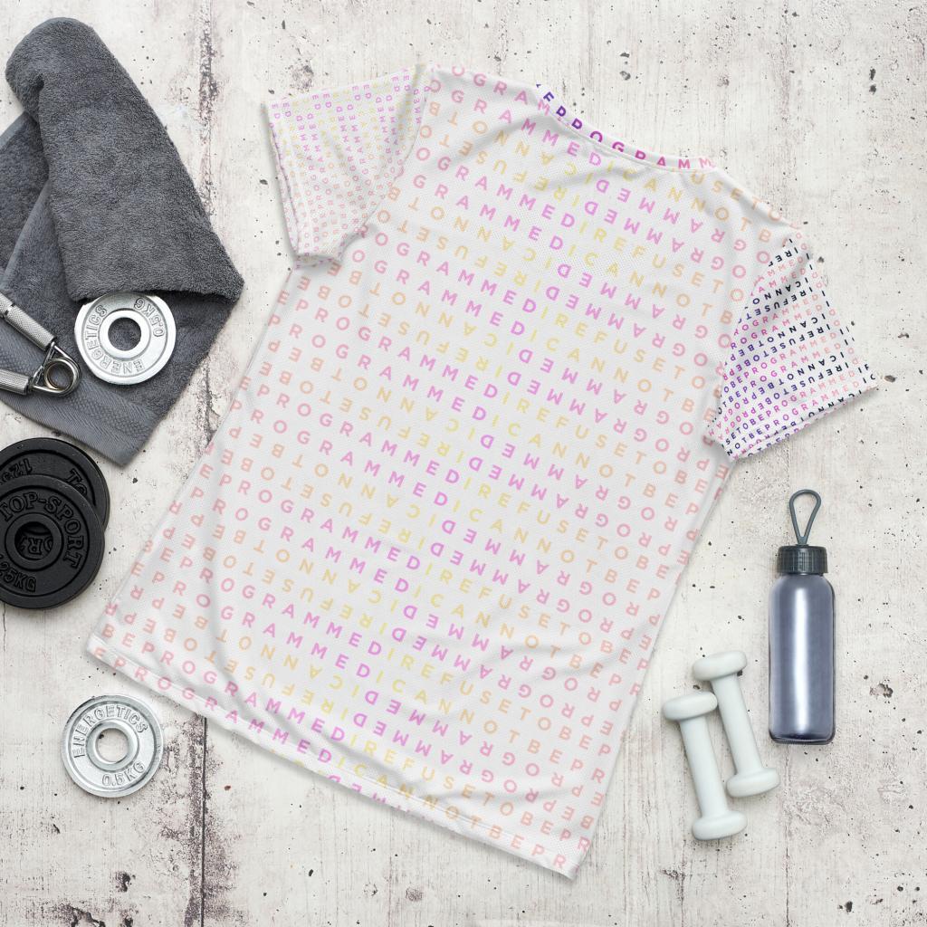 A Unique design featuring the I Refuse to be Programmed monogram in two signature pink designs that show a light pink “bubblegum” version on the back and right sleeve and a dark pink monogram on the front and left sleeve. This shirt combines comfort and style while having sports mesh fabric that supports moisture management to stay comfortable during exercise.