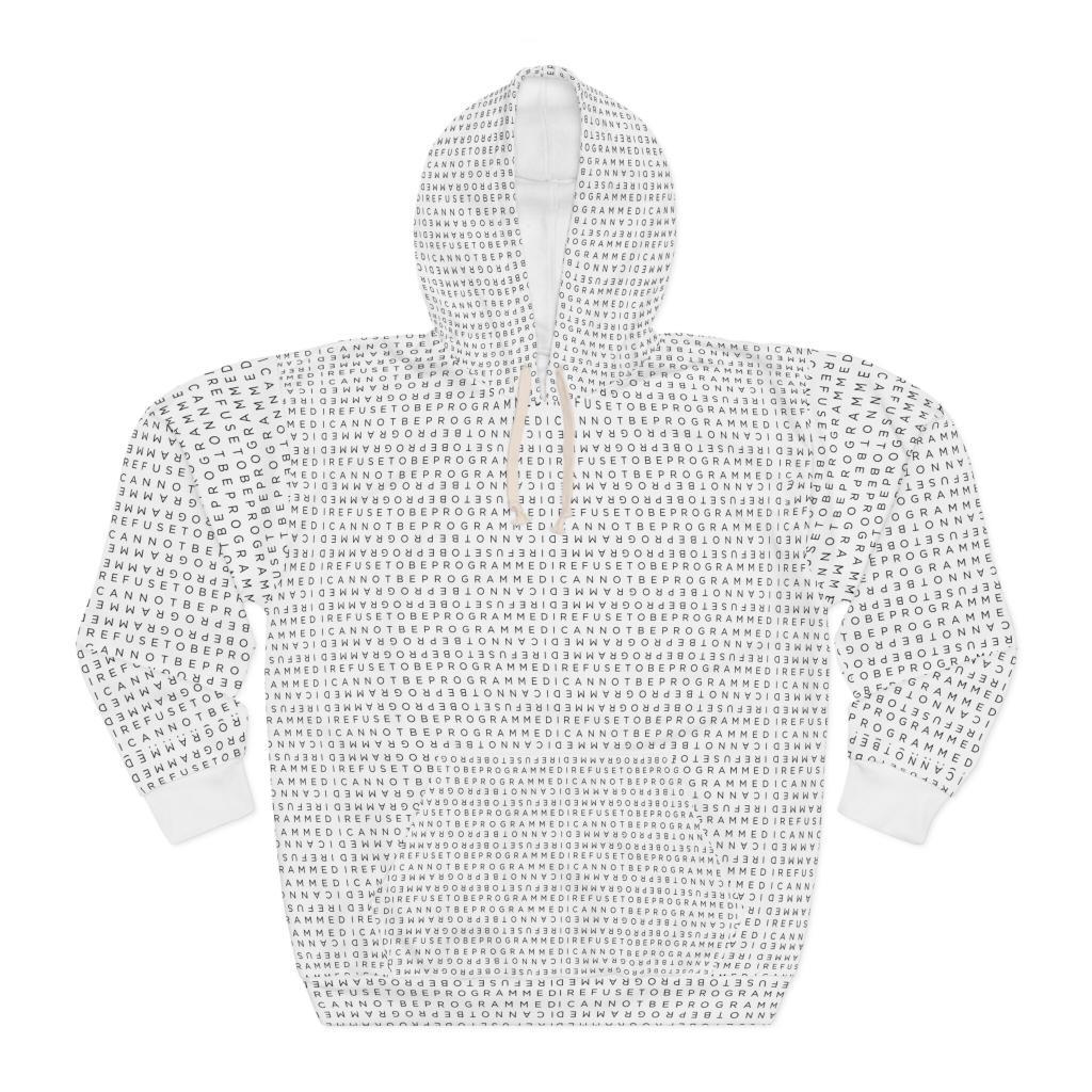 This Pullover Hoodie is made for warmth and comfort featuring the I Refuse to be Programmed standard black monogram cascaded atop white fabric. Made to be easily customizable and features a large front pocket, a hood with a drawstring, and is custom cut and sewn.