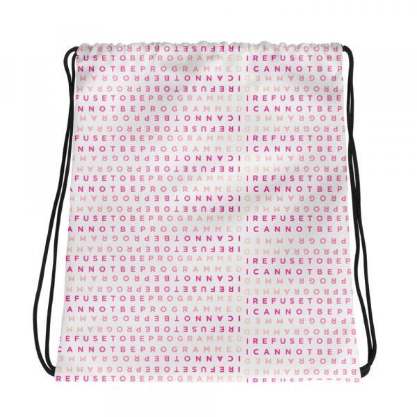 Show your stance with this standard gym drawstring bag that features the “I Refuse to be Programmed” monogram. Ability to hold up to 33 lbs and measure 15 x 17 Inches.