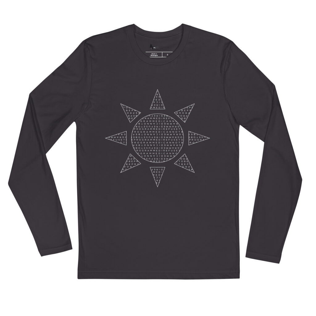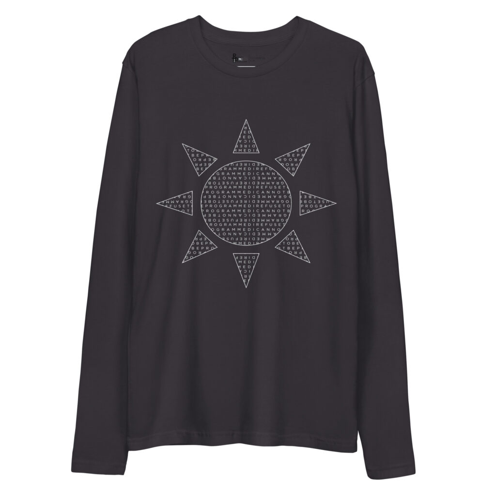 This I Refuse to be Programmed men’s super-soft crew sun graphic shirt is a unique look for wearing when the temperature begins to drop but is light enough to not be overbearing when its warm. This shirt is made from 100% ring spun cotton and features a graphic of a sun that is formed with the I Refuse to be Programmed monogram in white.