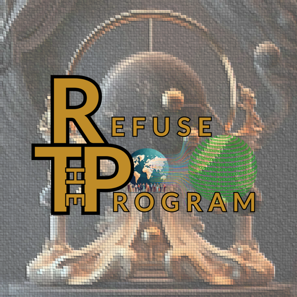 Another more simplified styling which is known as the RTP Logo features a uniquely formed interlock of the R, T and P letters and has Refuse The Program placed in a special ratio at the top, center, and base of the interlocking RTP symbol that is shown which creates an ancient glyph for healing and wisdom thorough the logo design.